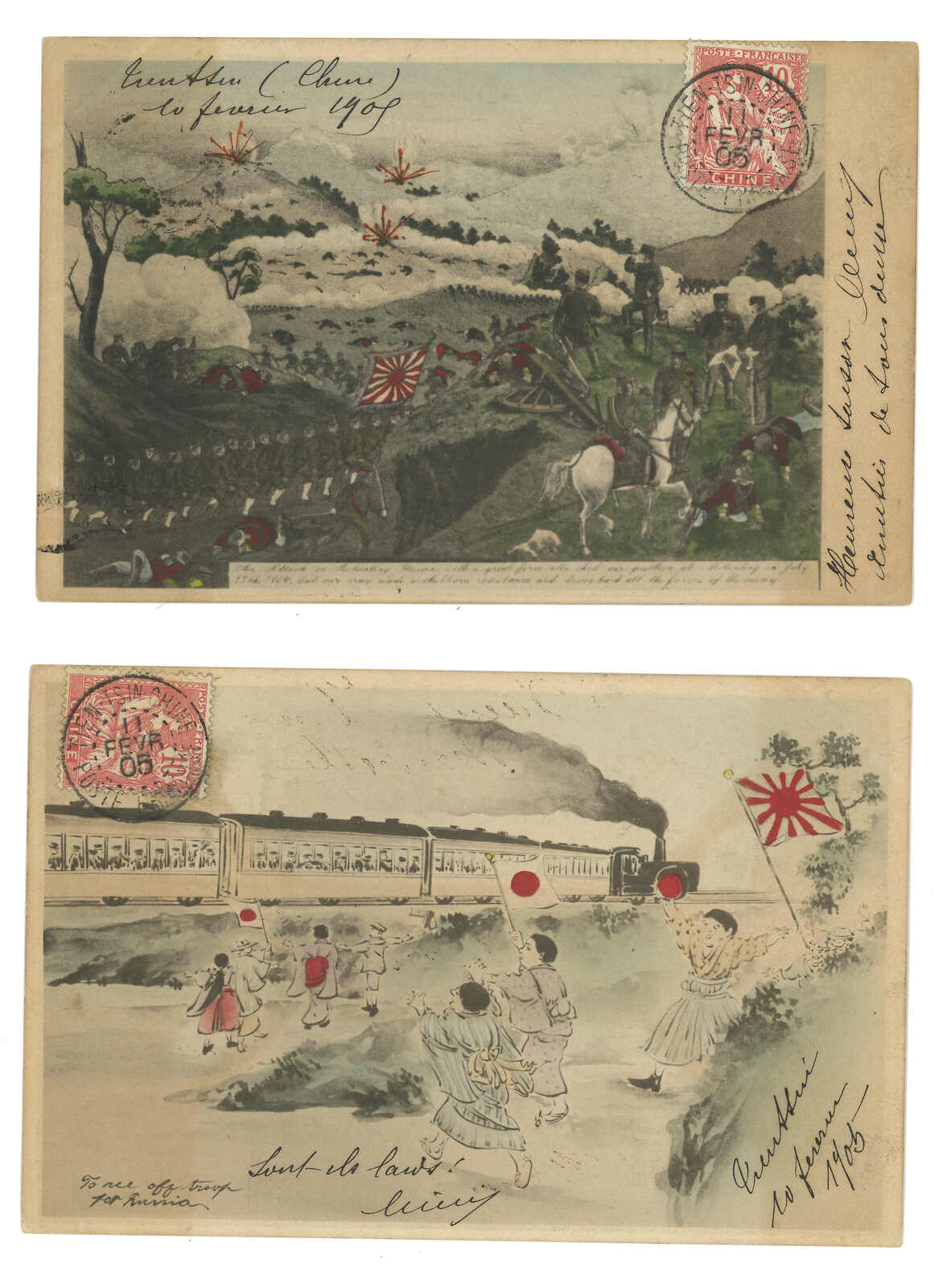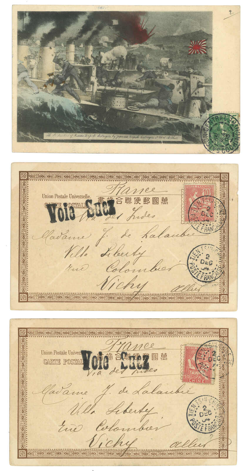 A group of 3 picture postcards in the theme of Russo-Japanese War, depicting war scenes on land and sea. All commercially used from Tientsin French PO or Saigon. Very historical.