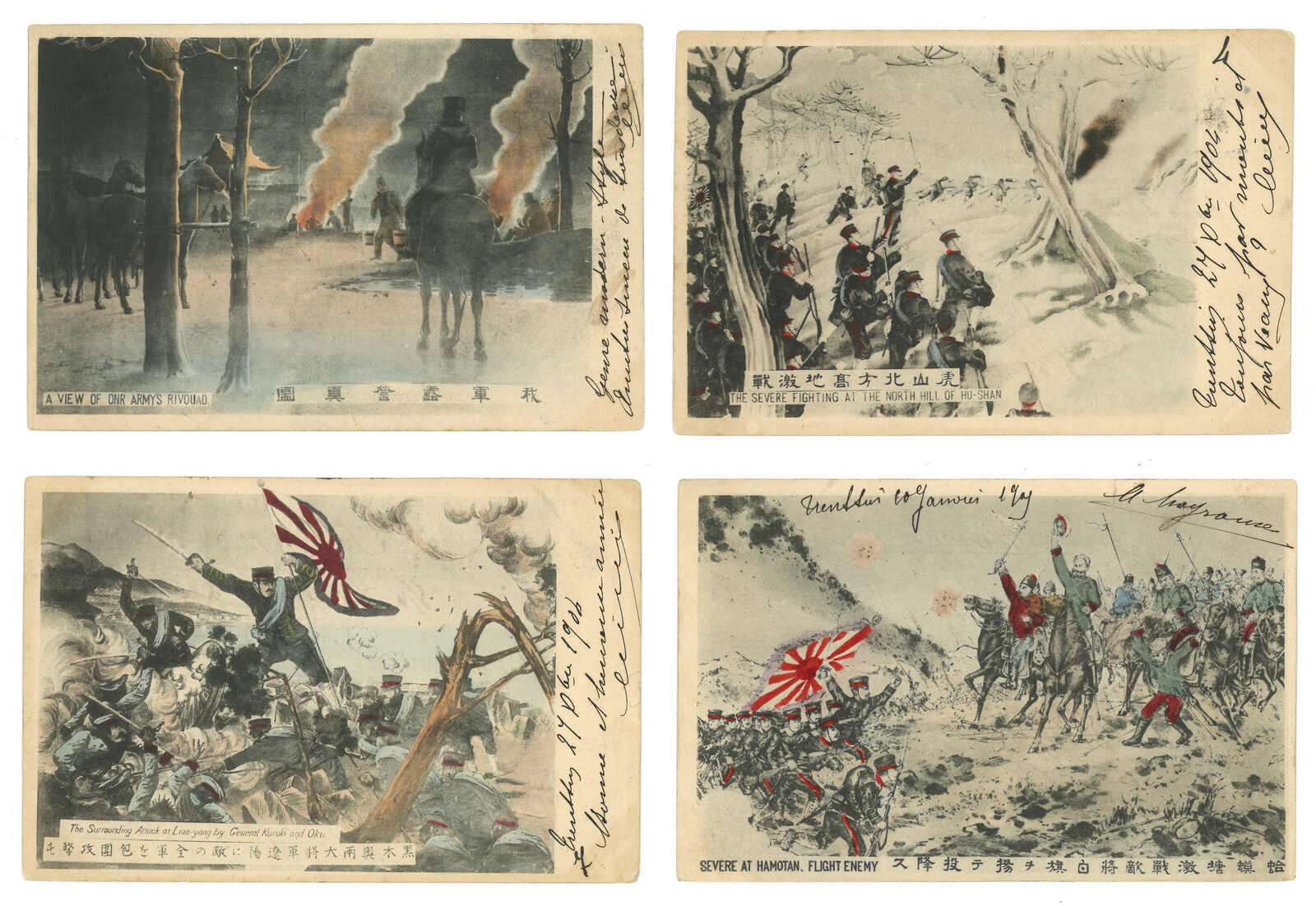 一組十張日俄戰爭主題圖片明信片,描繪了不同戰爭場景。當中一件印有東鄉平八郎與其他日軍將領於旅順之合照,並於旅順日本客郵局寄出。餘大多自天津法國客郵局實寄。極具歷史意義。(Image 1)