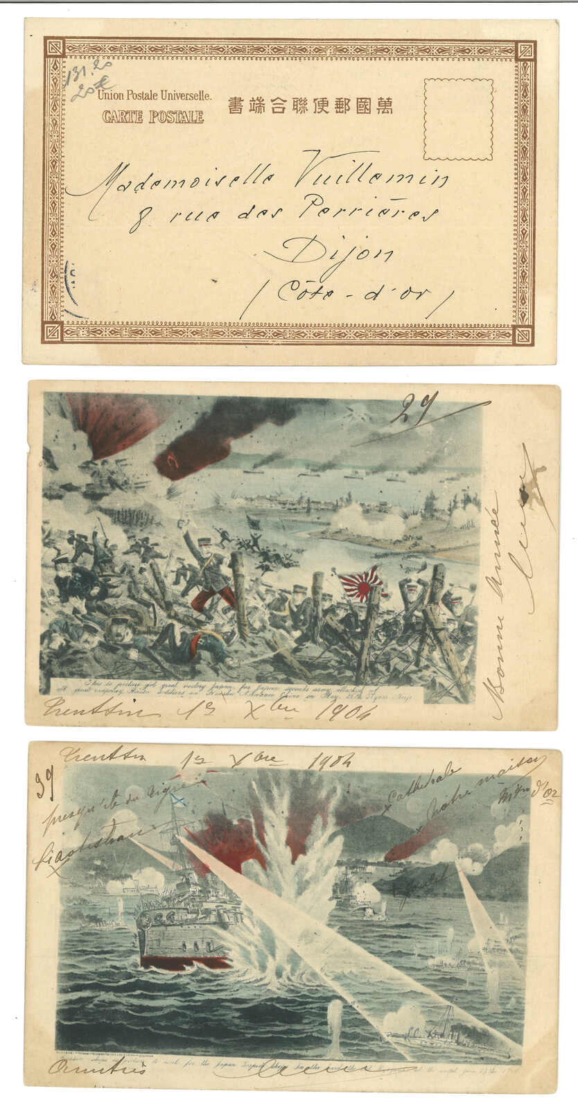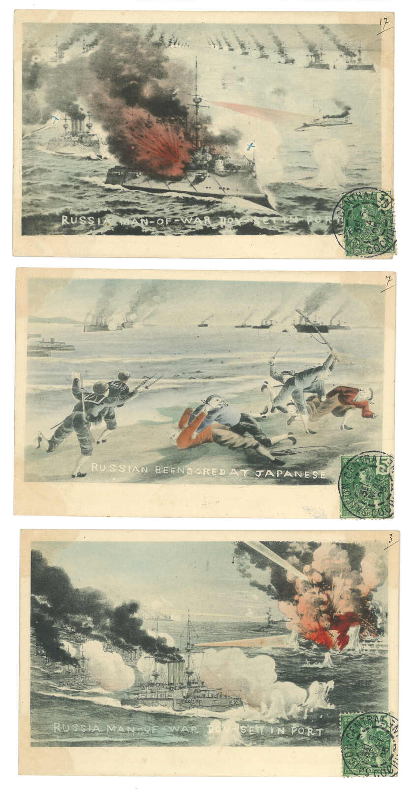 一組三張日俄戰爭主題圖片明信片,描繪了陸戰及海戰情景,應出自同一套,均自西貢實寄。極具歷史意義。(Image 1)