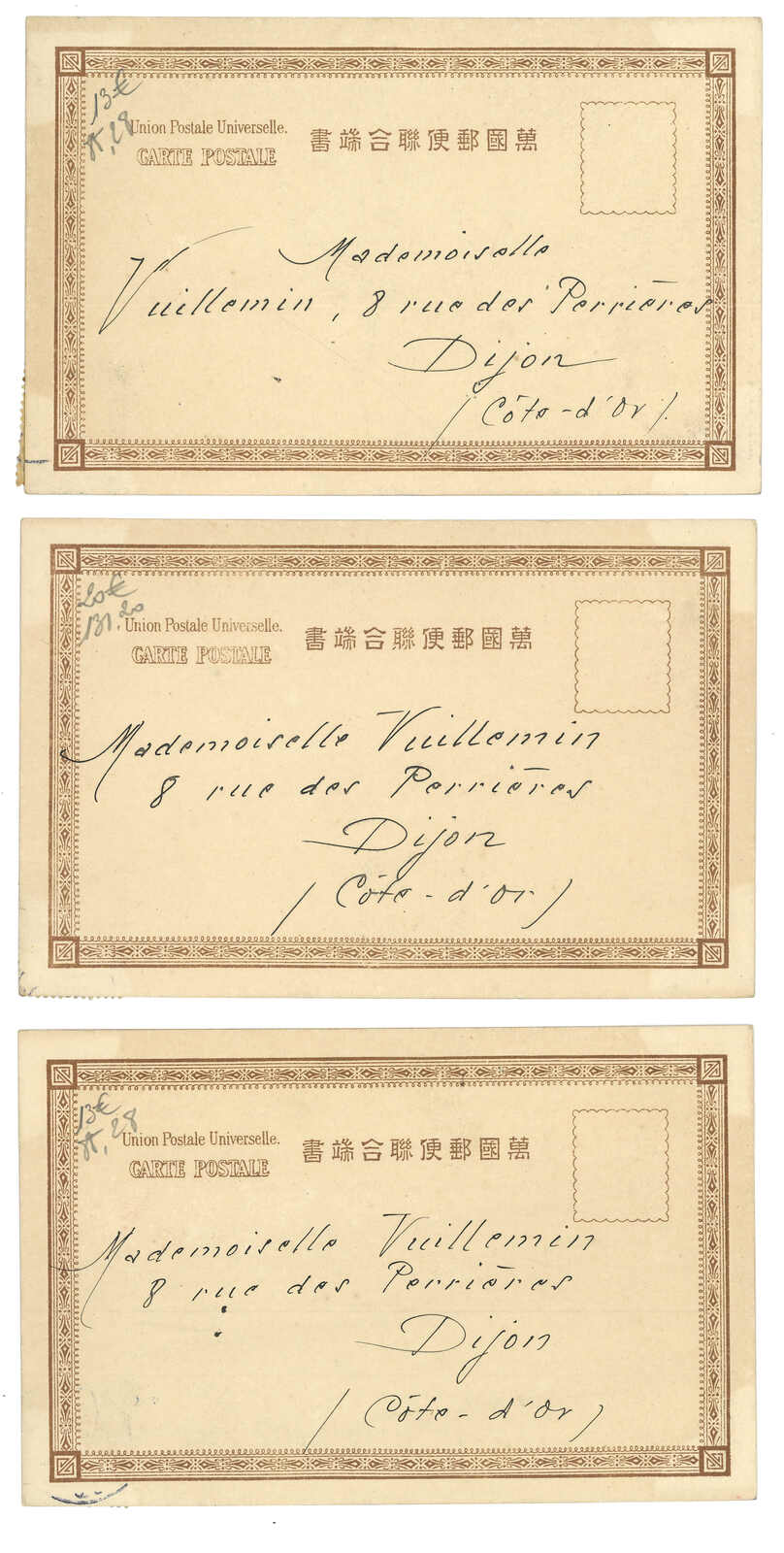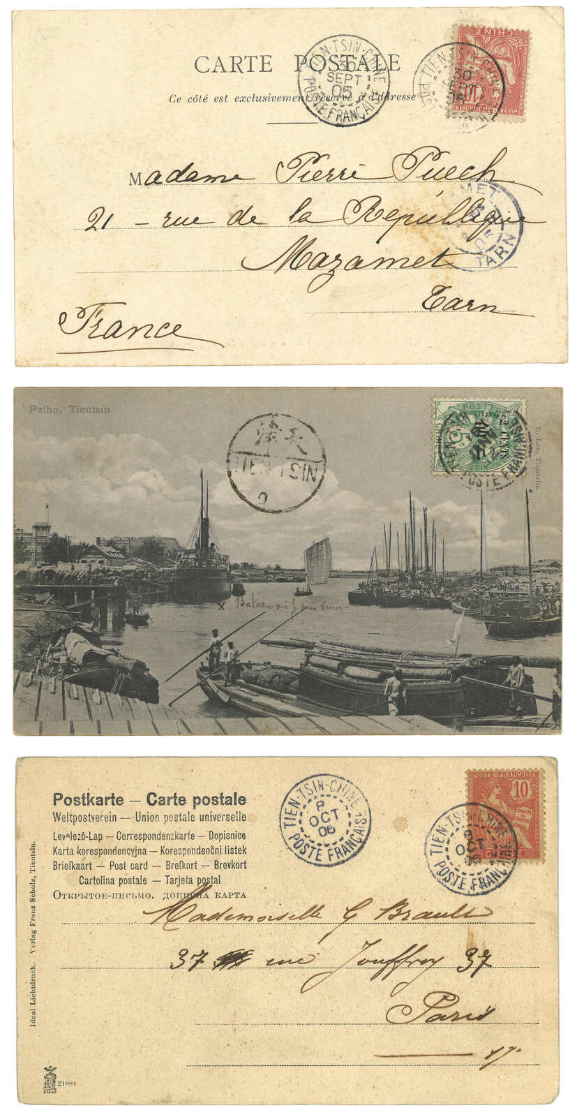 1905至1912年一組三件天津風光明信片,均由天津法局實寄,貼法國普通票。一件另鈐天津中國郵局中轉戳。(Image 1)