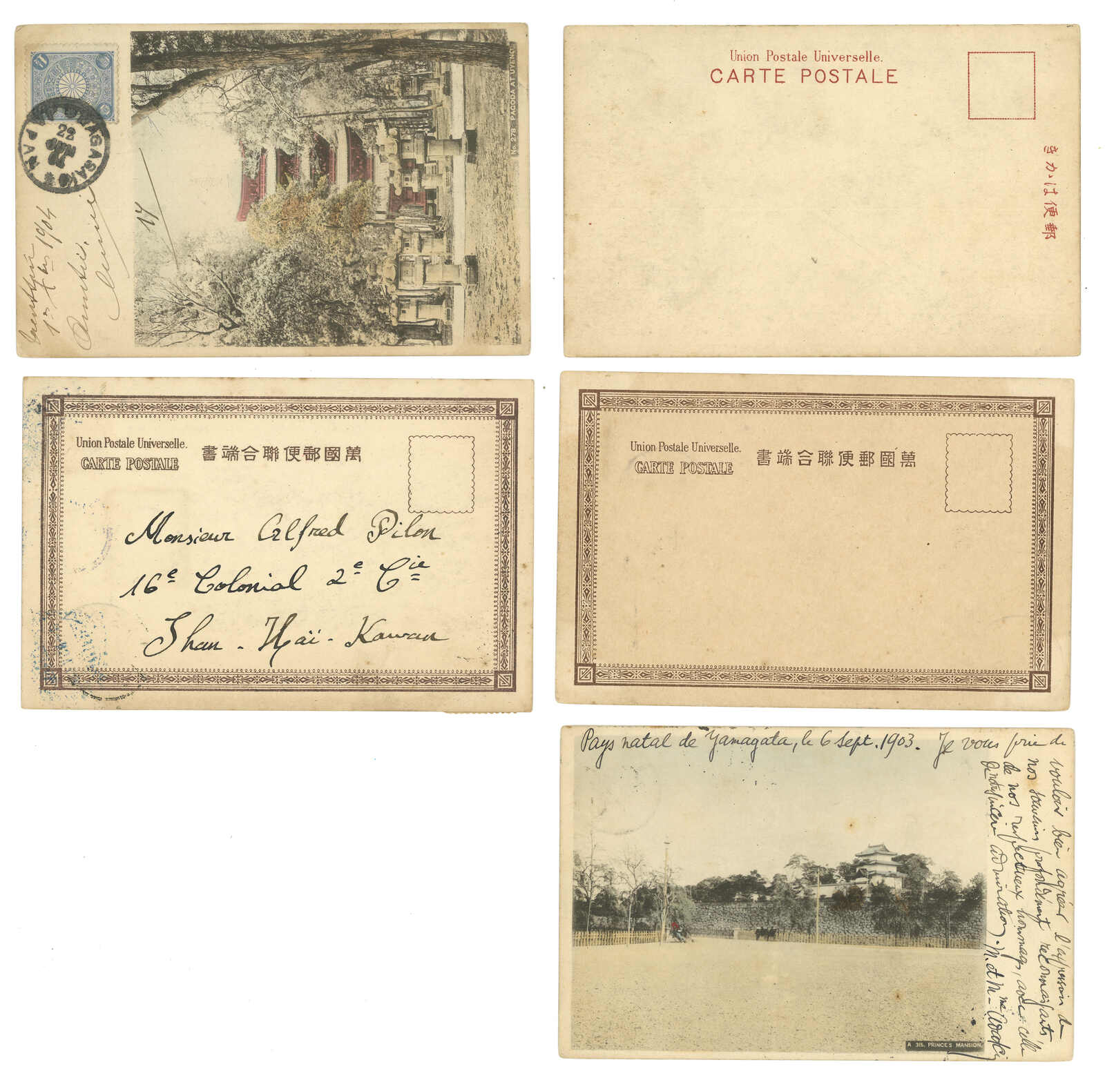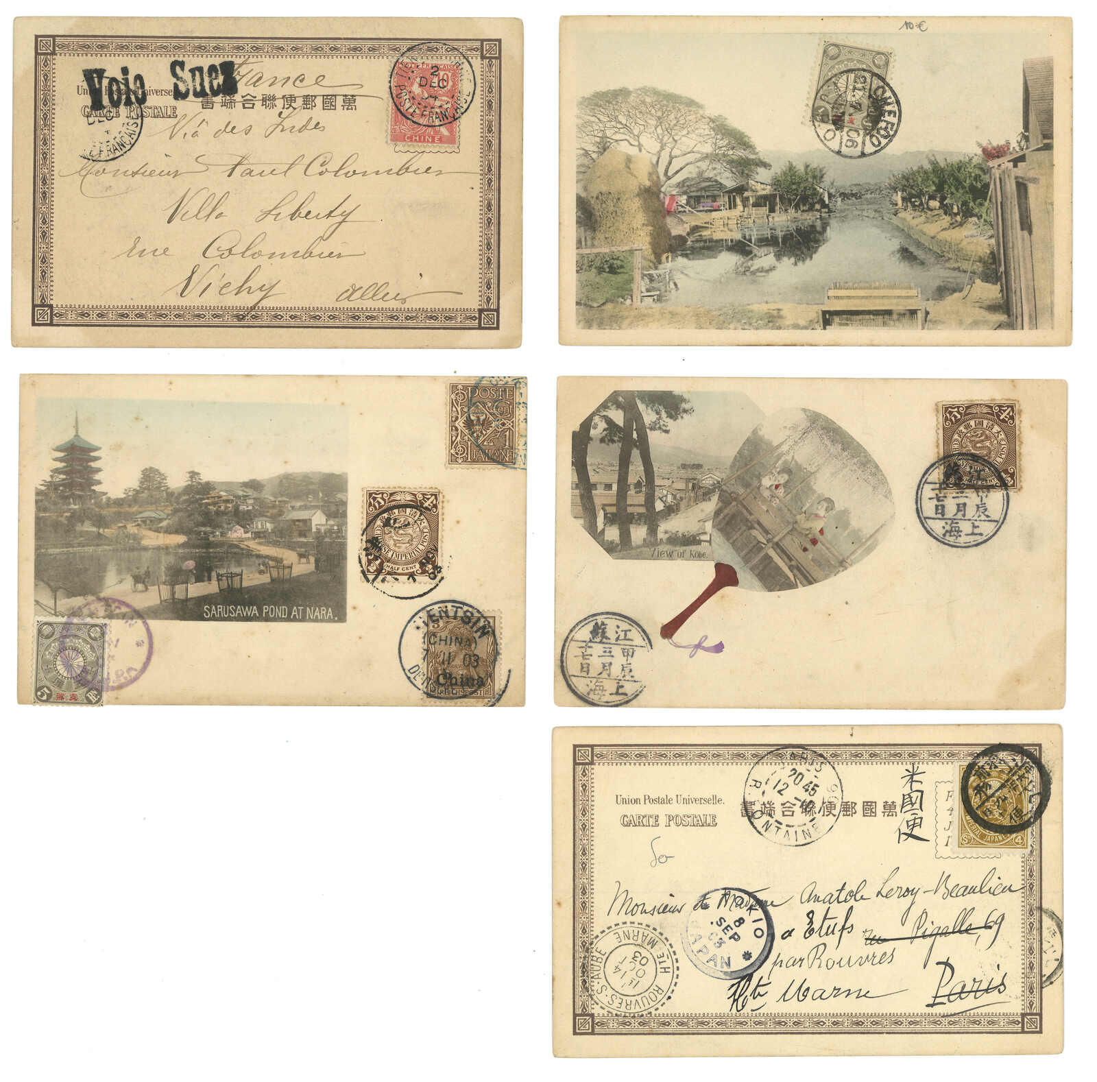 A group of 5 Japanese view PPC, all with franking and cancellations. One card f.w. Chinese, German, Japanese and Italian stamps and tied by corresponding Tientsin PO cds.