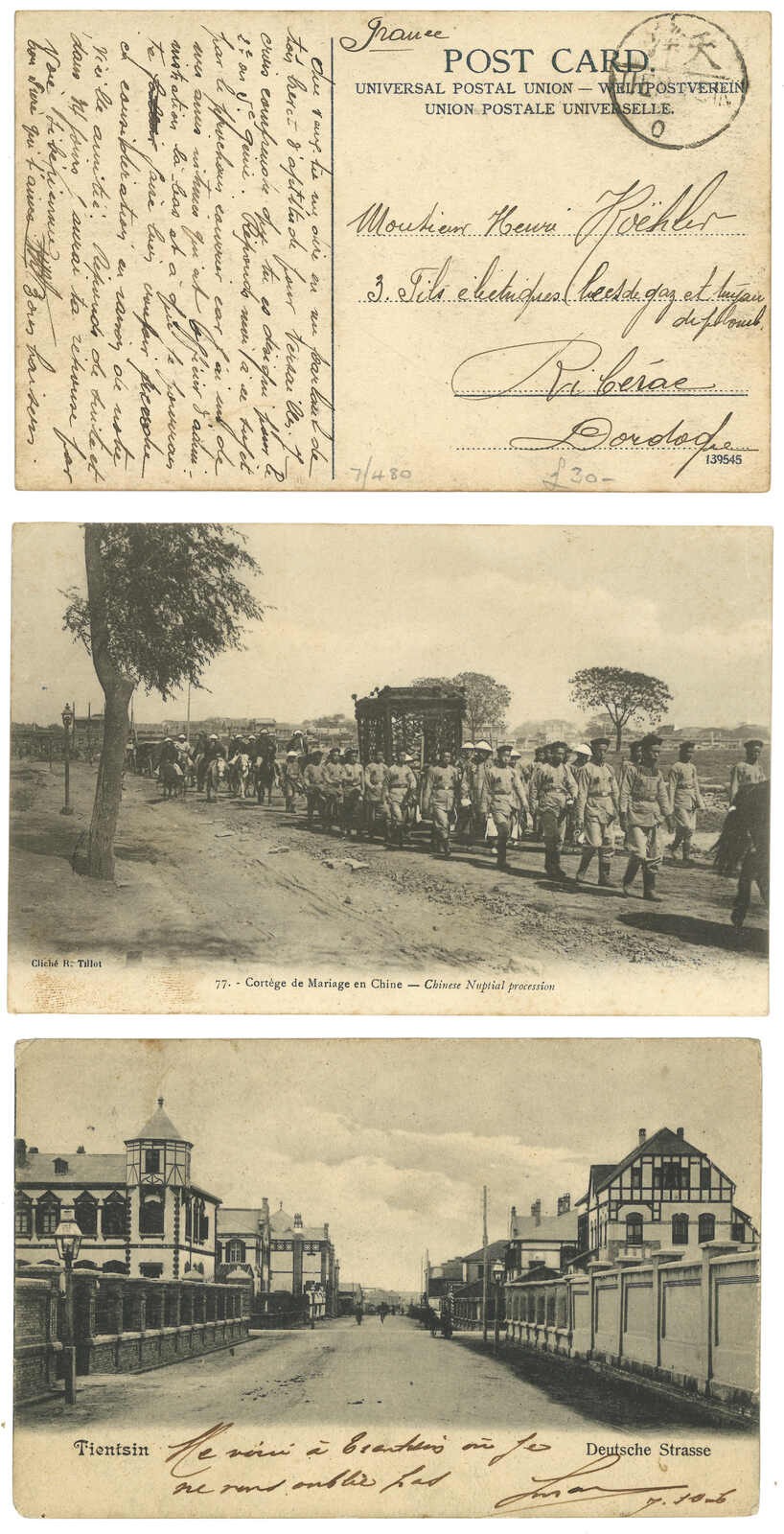 1905-1912 a group of 3 Tientsin view PPC, all commerically used from Tientsin French PO, f.w. French regular issue. One card with Tientsin Chinese PO transit cds.