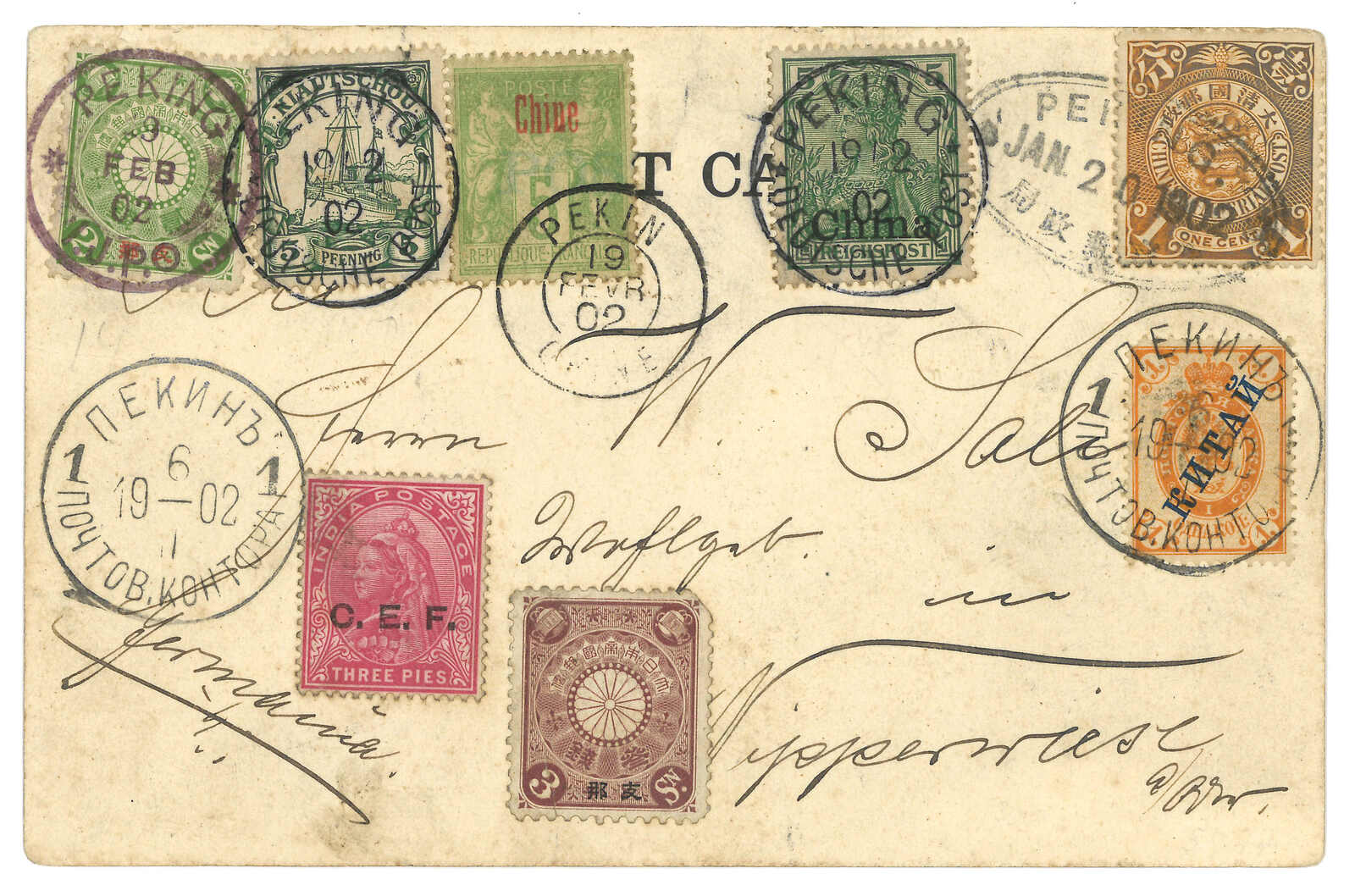 1902.2.9 一件貼有中、法、德、英印、日及俄國票之圖片明信片,銷對應之北京客郵局日戳。(Image 1)