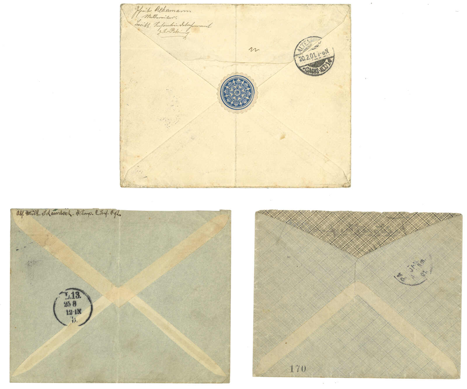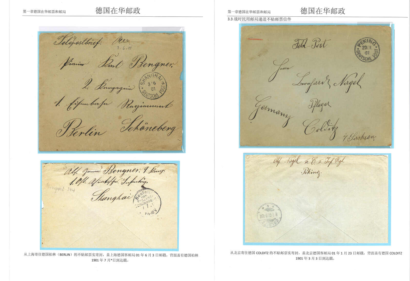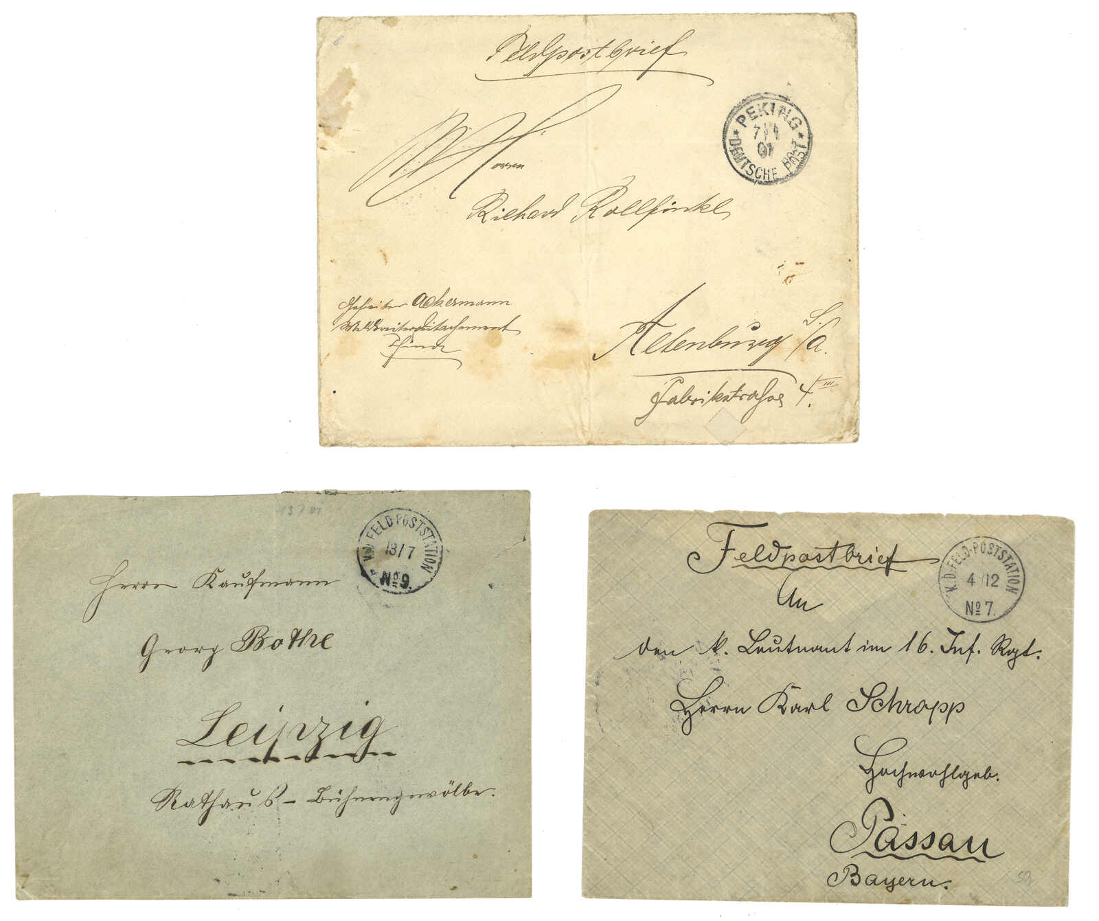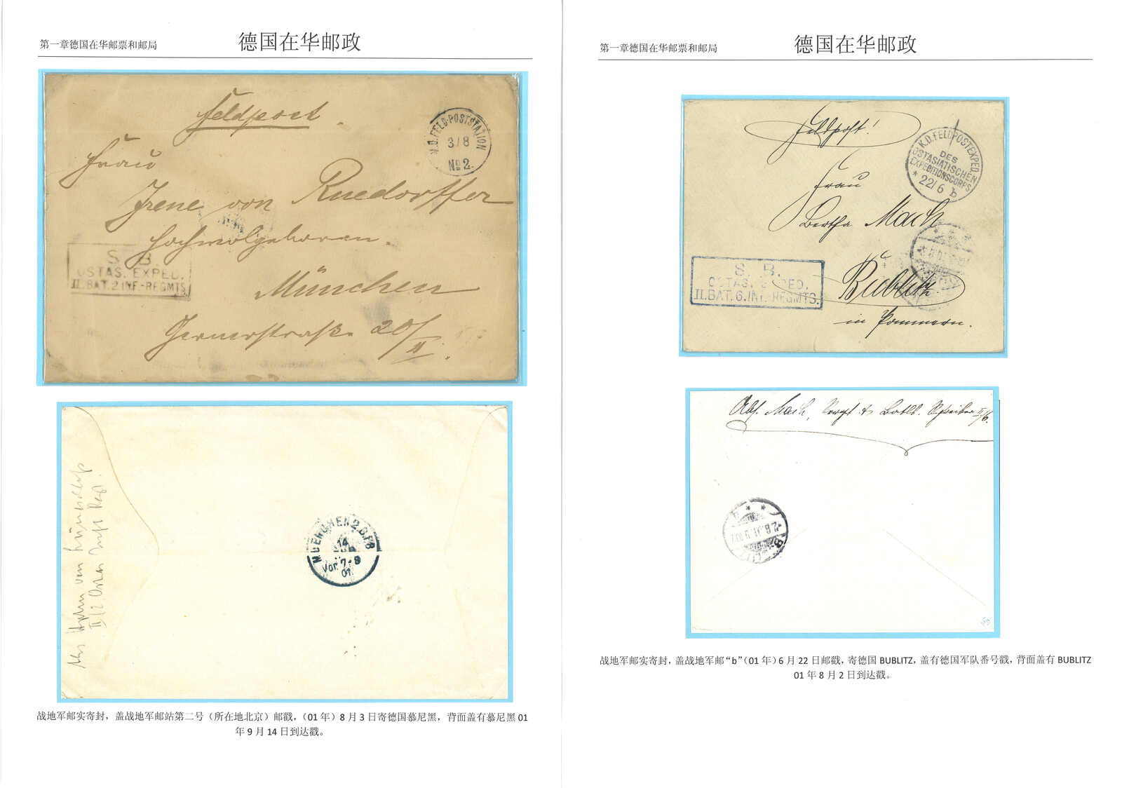 1900年代一組11件德軍在華軍郵封,大多無貼票,鈐東亞遠征軍、軍郵2、7、9局、上海及北京野戰軍郵局日戳。(Image 1)