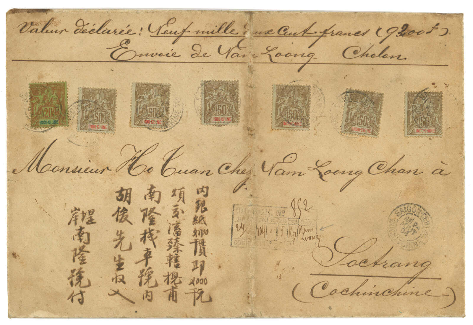 1904 (24 Aug) By a Qiaopiju in Cholon to ist branch in Soetrang for forwarding to addressee f.w. Navigation and Commerce issue 20c + 50c x 6, in total of 3fr20c, tied by Saigon cds. Stating that bankote of 9200 cash (i.e.