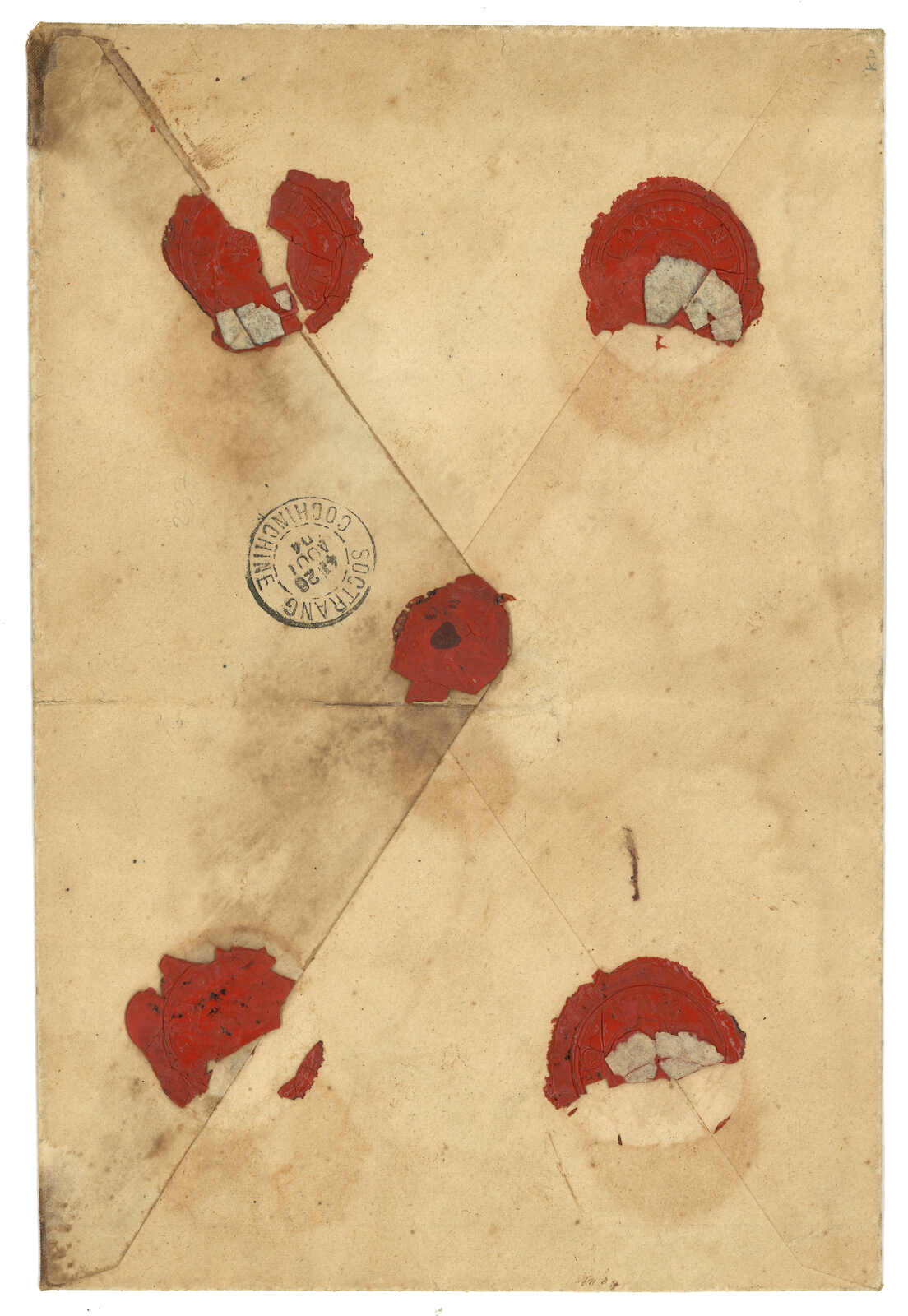 南隆號自堤岸寄畜臻分號,以交收款人胡俊。貼航海及商貿神像20分丁 + 50生丁x6,合3法郎20分丁,銷西貢日戳。封面寫明裝有銀紙9200貫即4000元。8.24經西貢。8.26抵畜臻。此寄款人將現金裝於信封中,經郵局送遞。可遇不可求之出色例子。封中折。2008年版許茂春著《東南亞華人與僑批》第120頁2-33原件。(Image 1)
