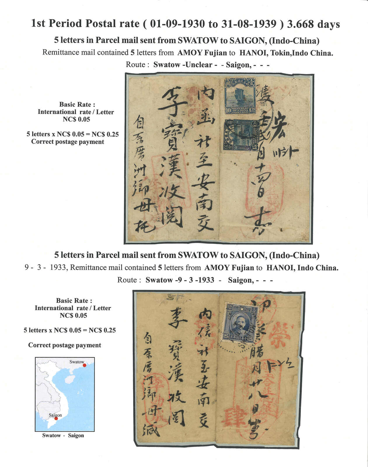 1930年代一對澄海寄西貢回批,貼帆船或孫像票合2角5分國際信函郵資,銷汕頭日戳,旁鈐批局直戳。均打開以作展示。2008年版許茂春著《東南亞華人與僑批》第125頁2-45及第126頁2-47原件。(Image 1)