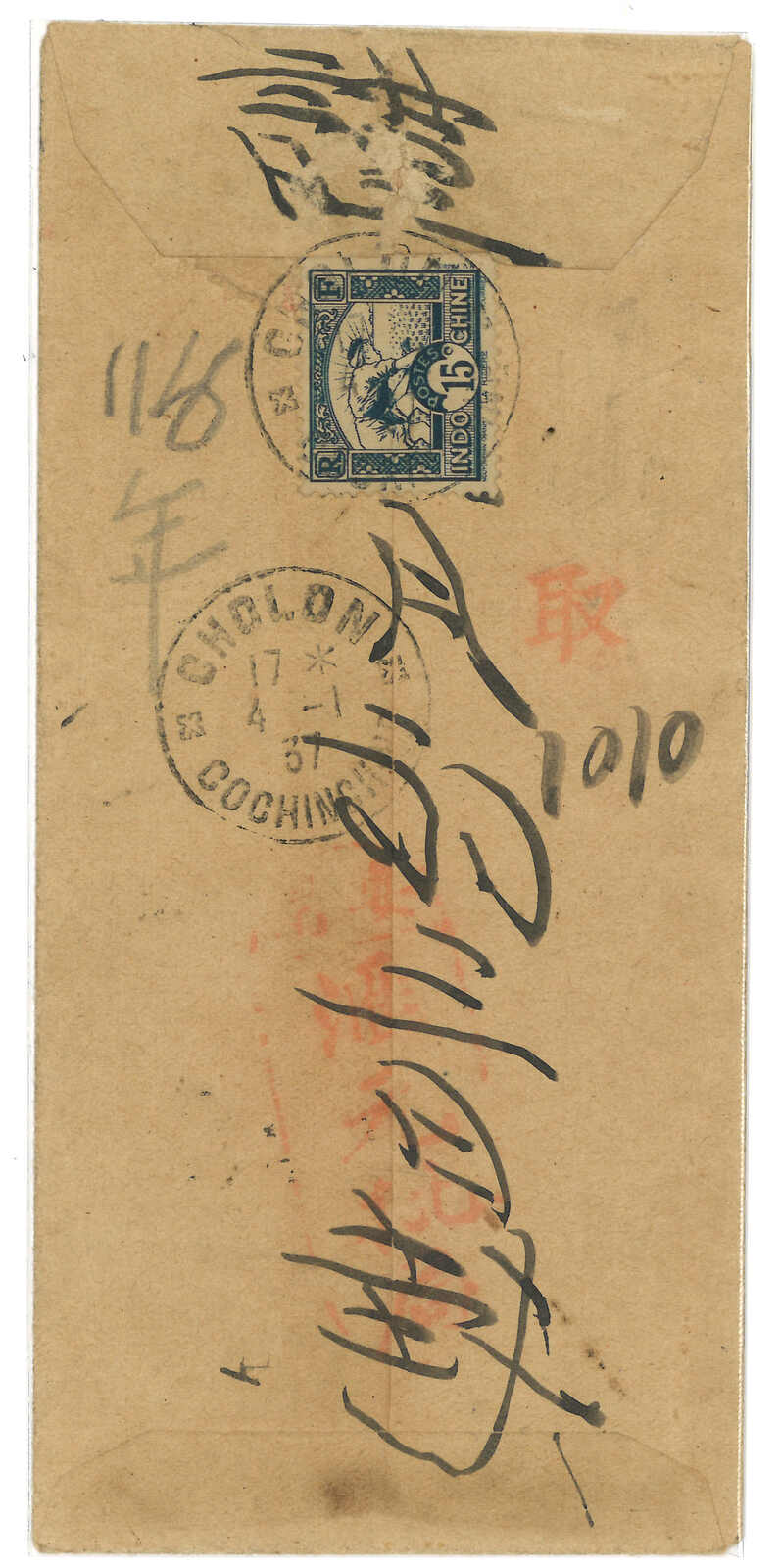 1937 Suwannaket, Laos to Jaoping. Qiaopi (money remittance letter), f.w. French Indochina 15c on reverse, tied by Cholon (4 Jan) cds , alongside with serial number manuscript and Annam Qiaopiju vertical seal. Despite being part