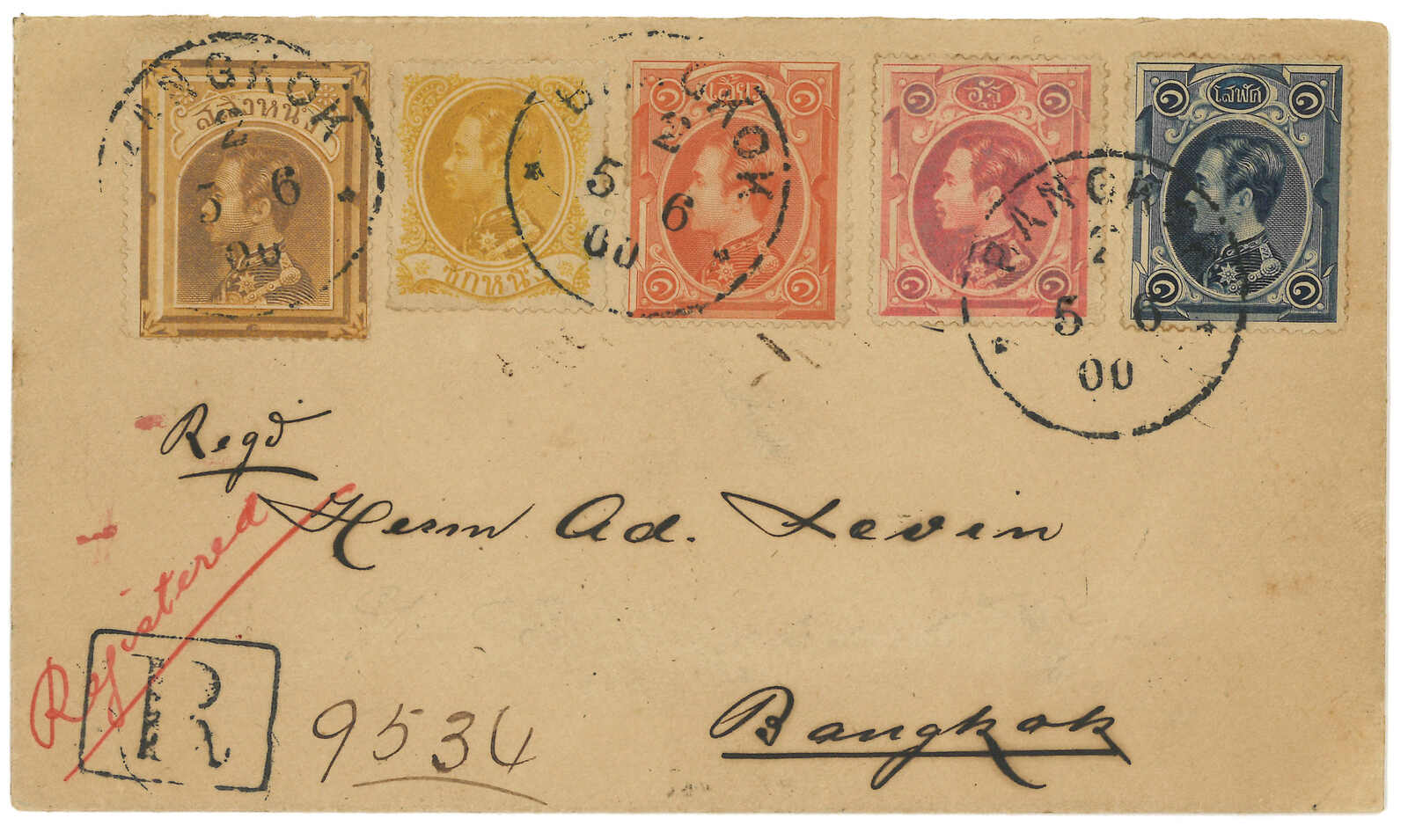 1900.6.5 曼谷本埠掛號封,貼Solot第一版全(Somchai 1-5),銷曼谷日戳,旁鈐R章。(Image 1)