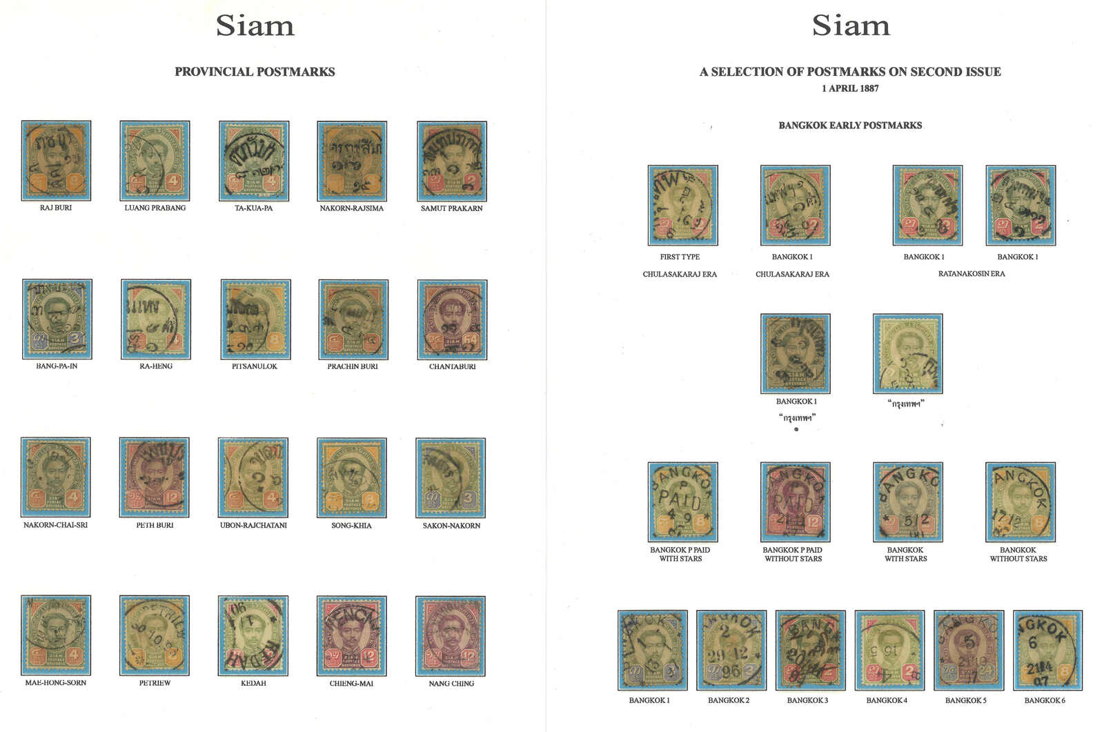 1887 a collection of 36 King Chulalongkorn 2nd issue used stamps, showing different types of Bangkok as well as other provincial cds. Orderly arrnaged on exhibit pages.