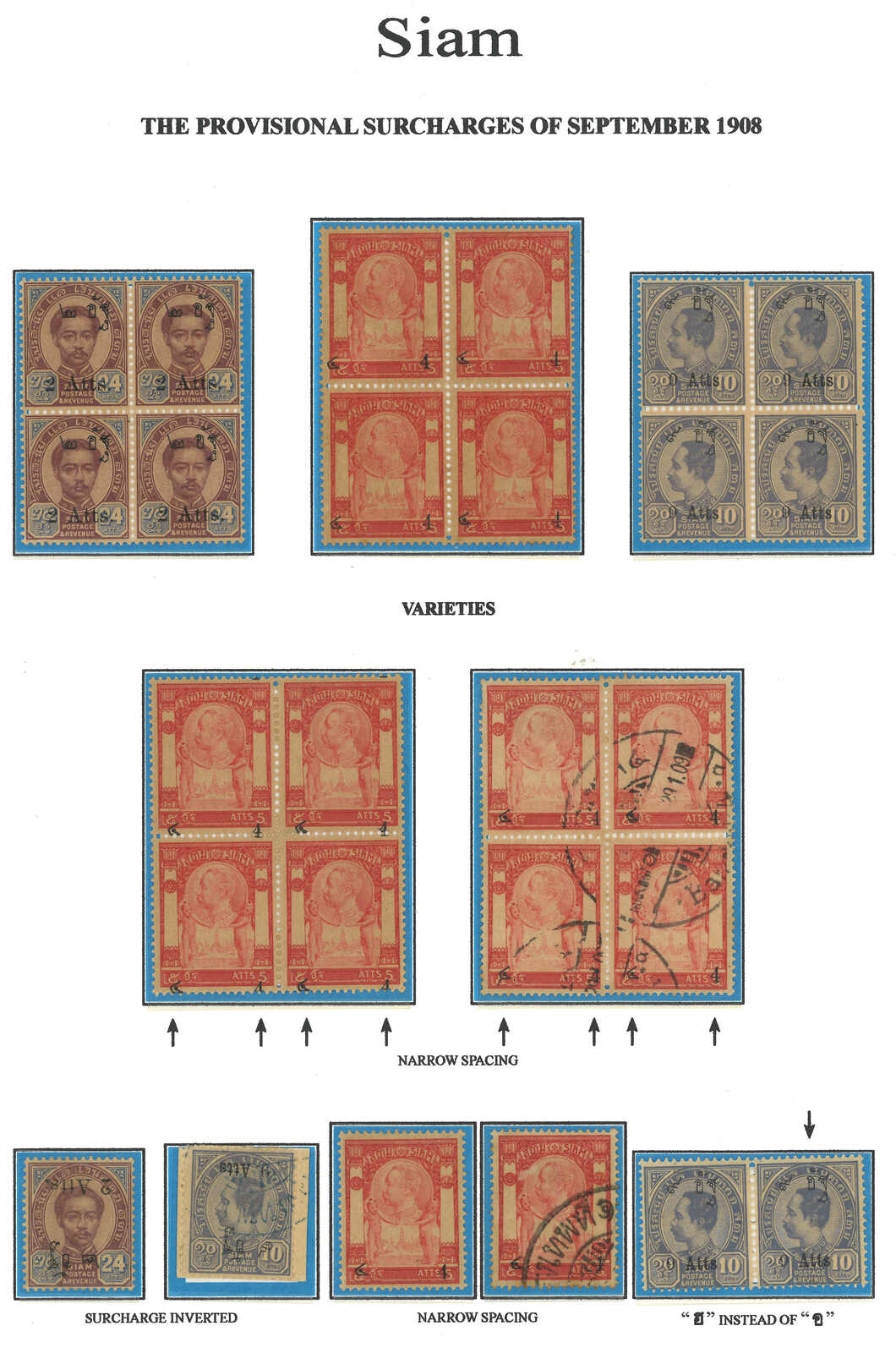 1908年朱拉隆功像臨時改值票四方連新,另附14枚變異票。前者背貼,後者包含稀罕之2 Atts及9 Atts加蓋倒蓋票(Somchai 117a, 119a)。出色。(Image 1)