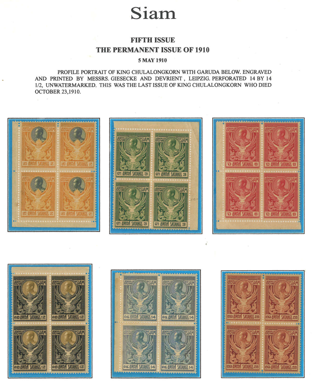 1894至1910年一組朱拉隆功像1 Att蓋64 Atts、1909年臨時改值票及拉瑪五世“神鳥”方連集藏(Somchai 49-50, 145-147, 148-153),每套至少包含一套四方連新全。(Image 1)