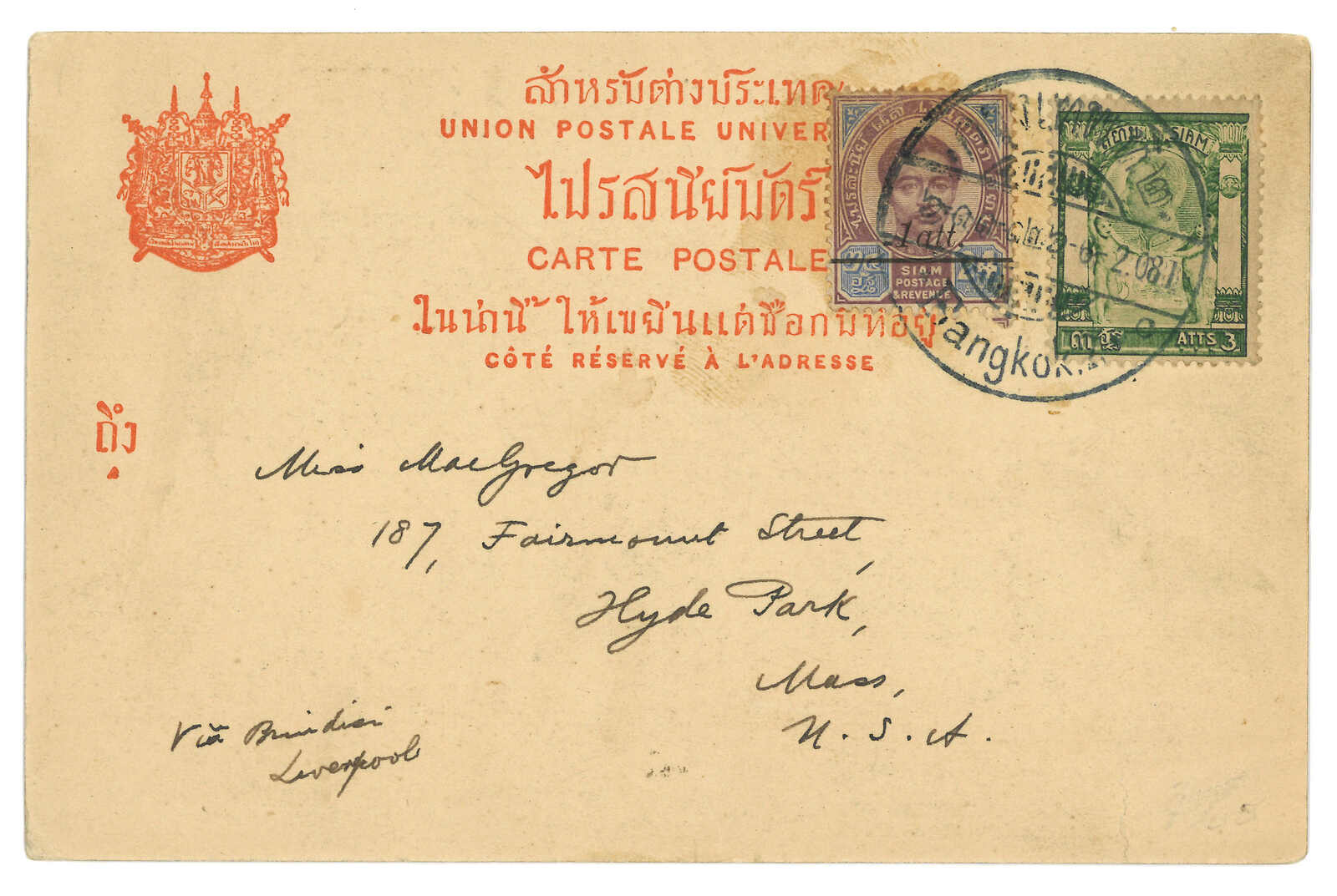 1907.6.20 曼谷寄美國。掛號封,貼朱拉隆功像改值1a/24a雙連(Somchai 116)+ 鄭王廟8a x2,銷曼谷4局日戳。7.2經倫敦,8.6經紐約。8.6抵波士頓。(Image 1)