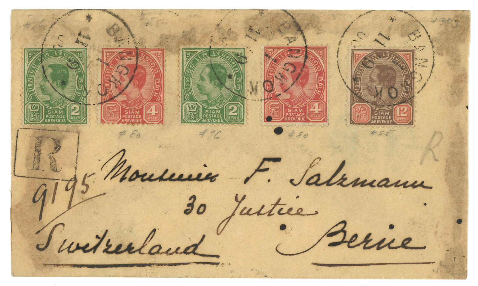 曼谷寄瑞士。掛號封,貼朱拉隆功像第三版5枚,合24a,銷曼谷1局日戳,旁鈐R章。經米蘭、博洛尼亞。10.12抵Bern。(Image 1)