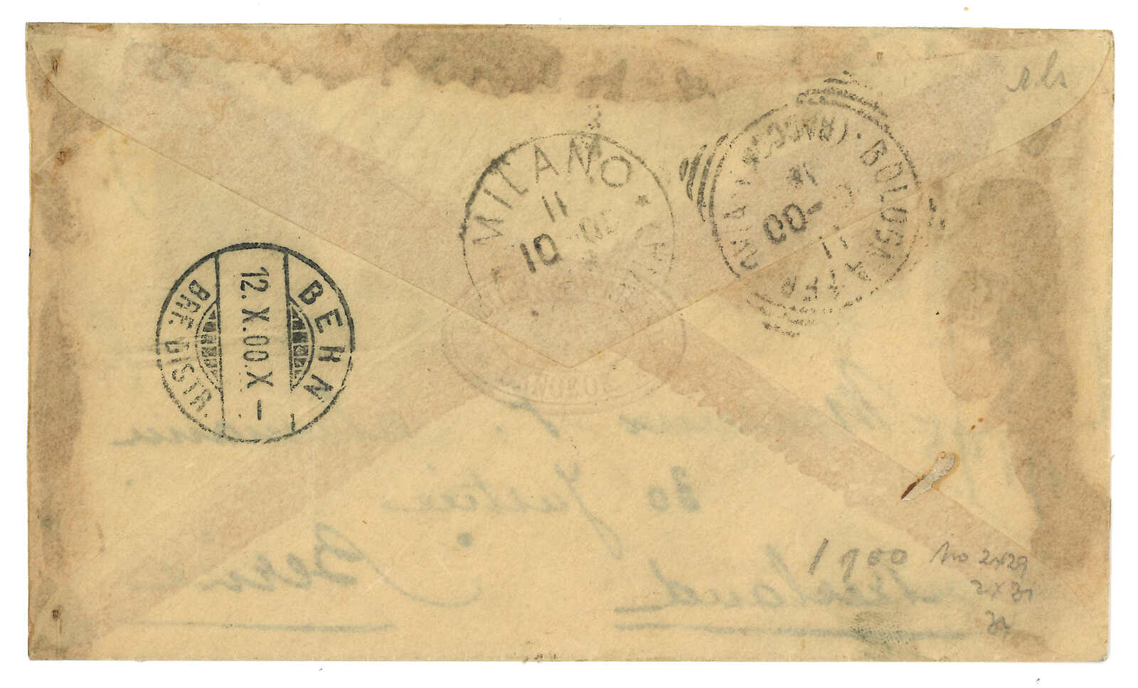 1900 Bangkok (11 Sep) to Switzerland. Registered cover, f.w. King Chulalongkorn 3rd issue x5, in total of 24a, tied by Bangkok 1 cds., alongside with R mark. Transit Milan, Bologna. Arrived Bern (12 Oct).