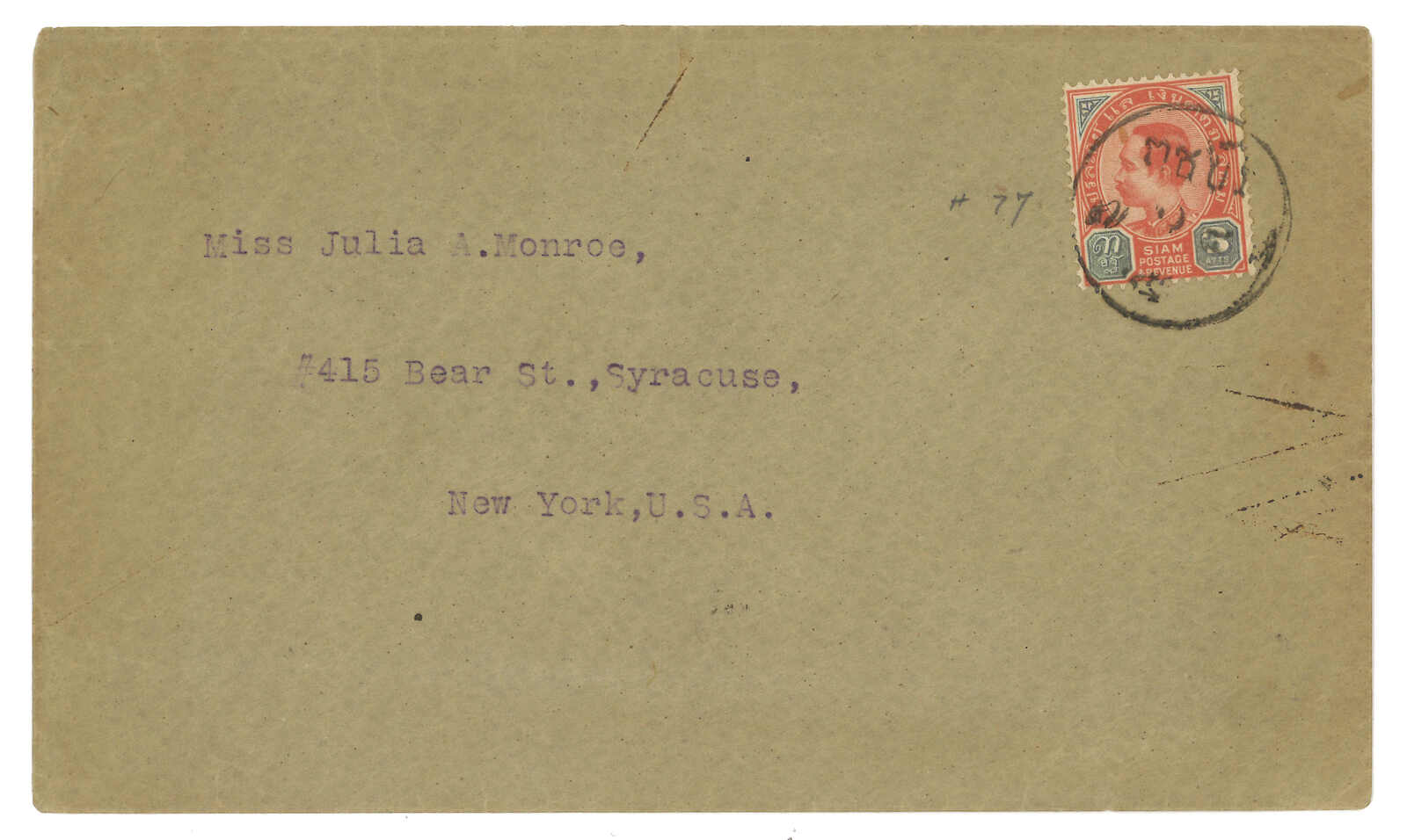 1900 Rajburi (7 Apr) to USA, f.w. King Chulalongkorn 3rd issue new denomination 6a (Somchai 91), tied by Rajburi cds. Arrived Syracuse (16 May).