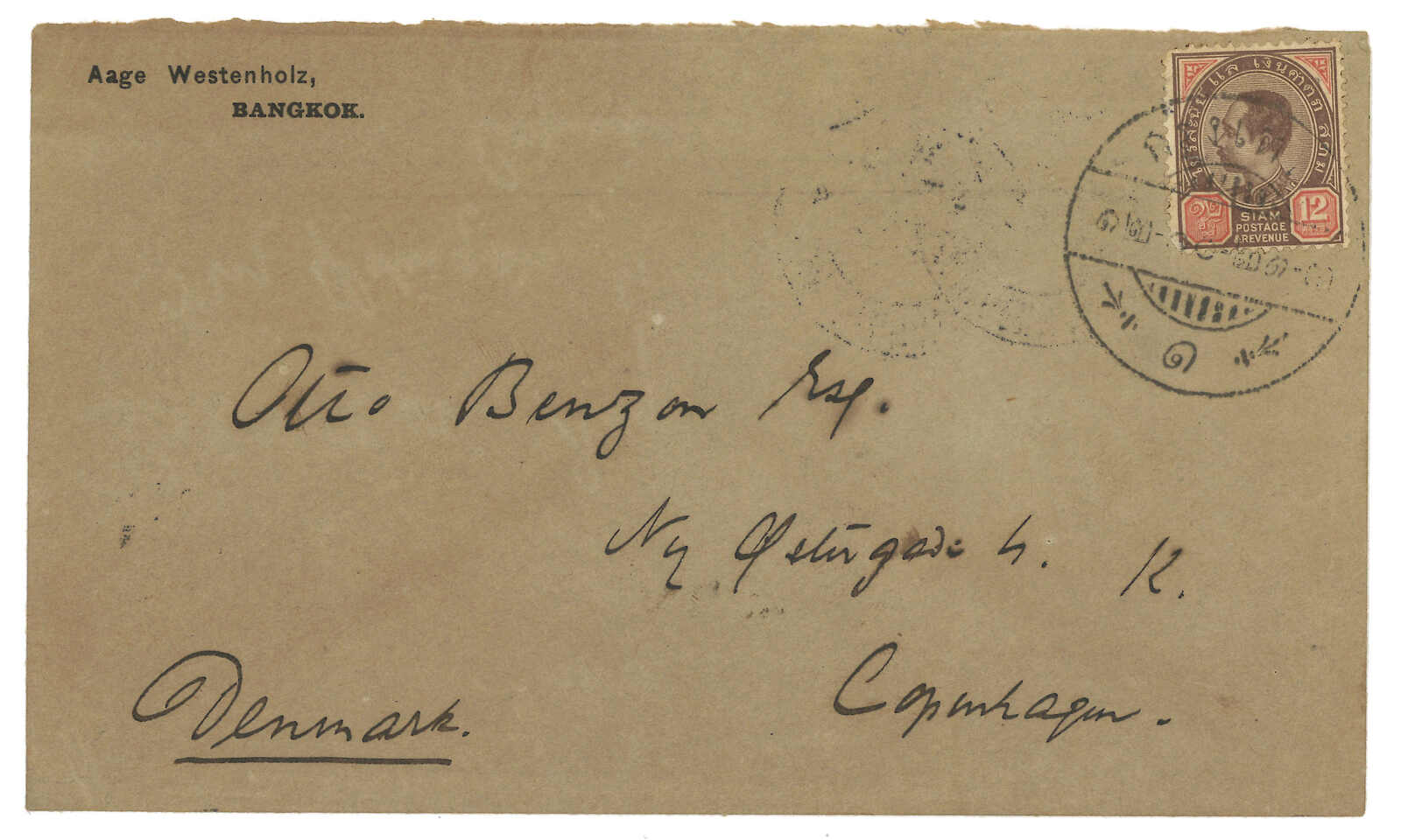 1903 Bangkok (12 Jan) to Denmark, f.w. King Chulalongkorn 3rd issue 12a (Somchai 84), tied by Bangkok 1 cds. Arrived Kjobenhavn (2 Feb).
