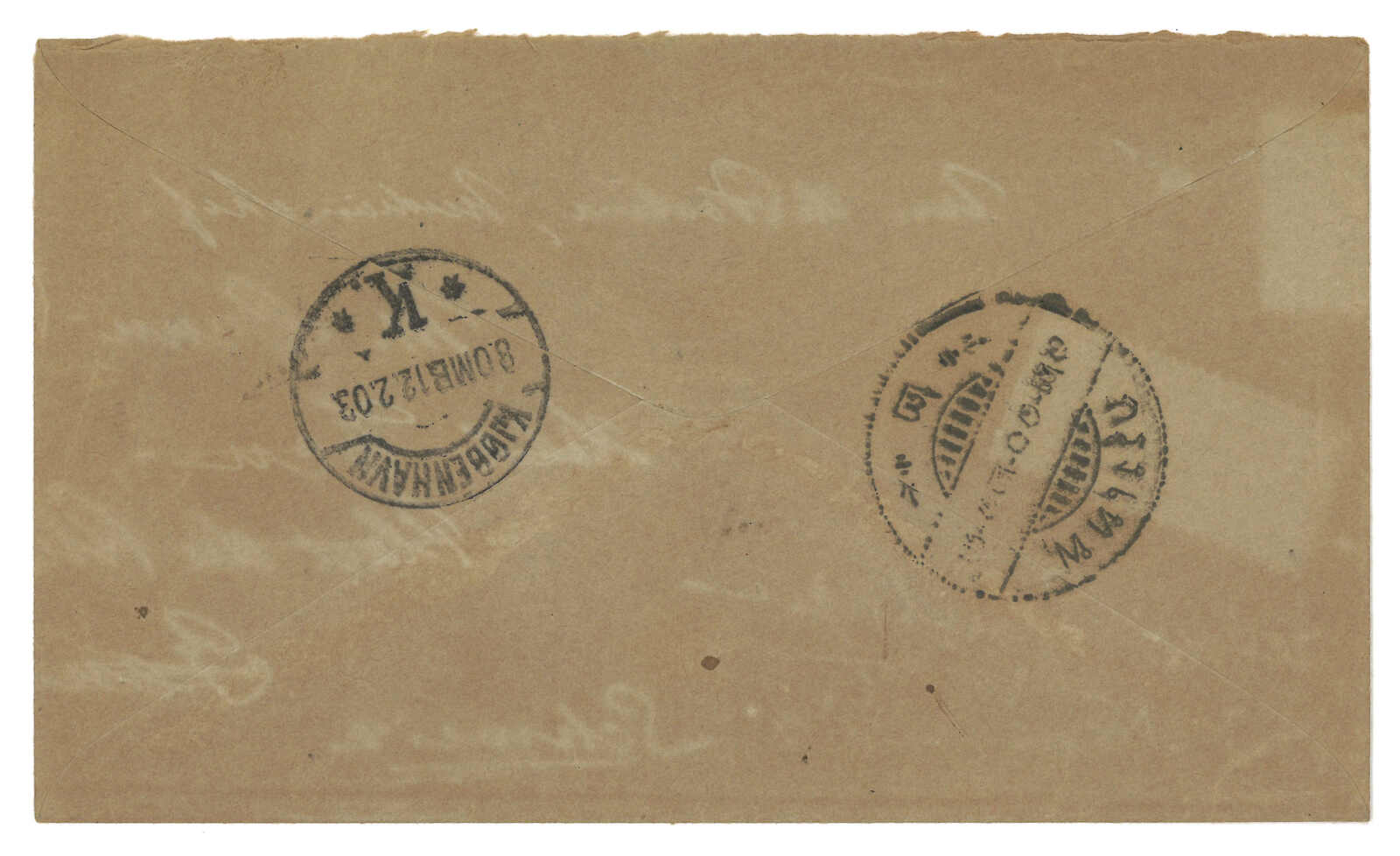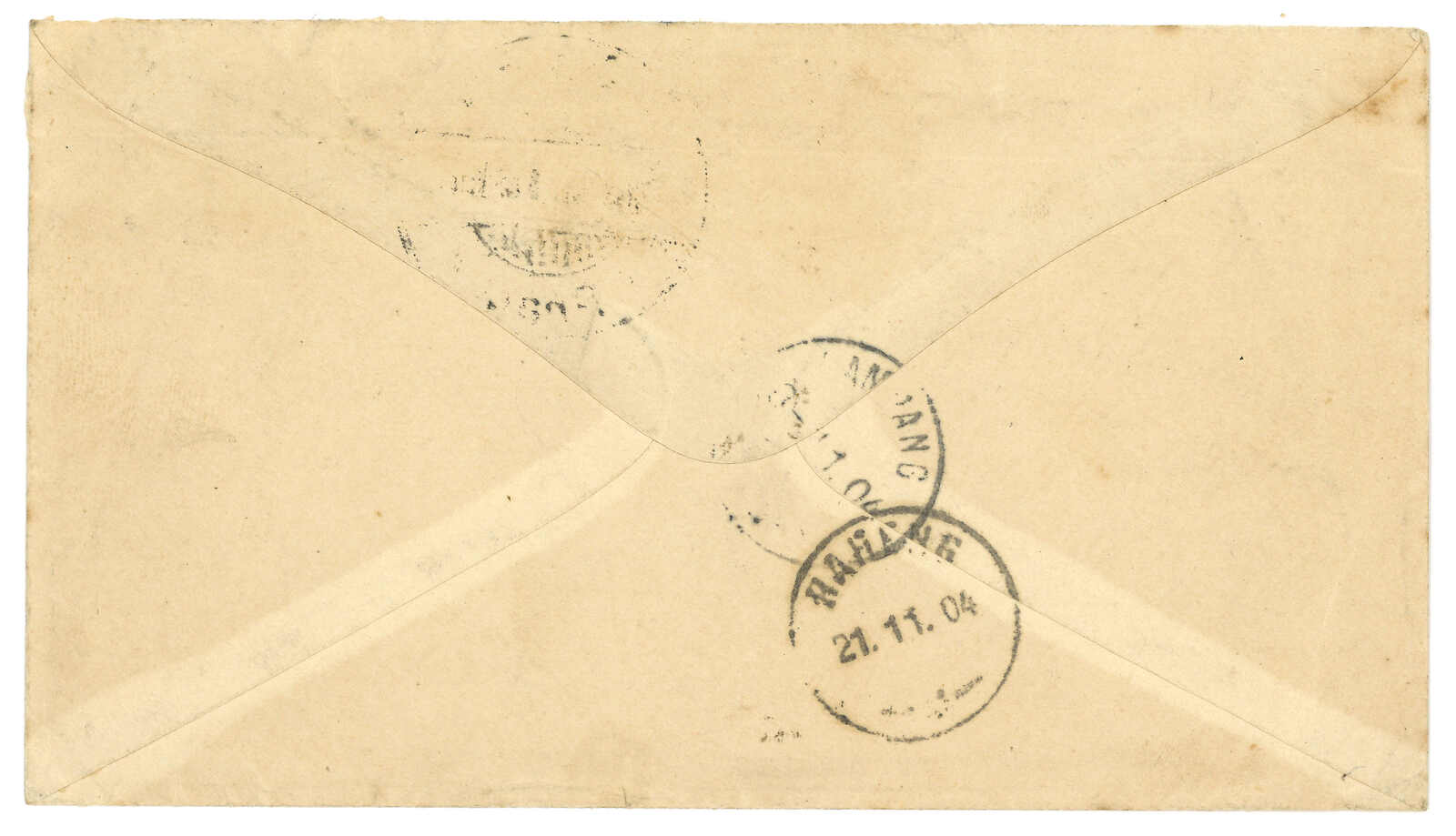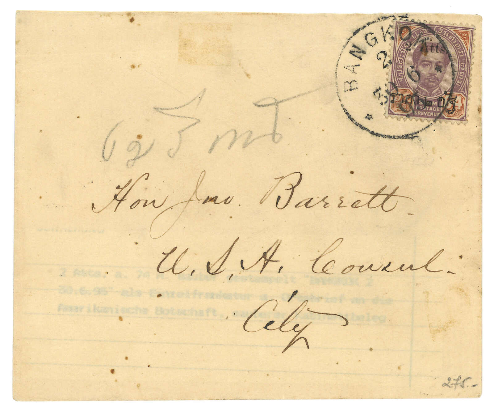 1895 (30 Jun) Bangkok local, addressing to USA Consul, f.w. King Chulalongkorn surch 2a/64a (Somchai 69), tied by Bangkok 2 cds. On reverse with another strike of Bangkok cds. Scarce franking.