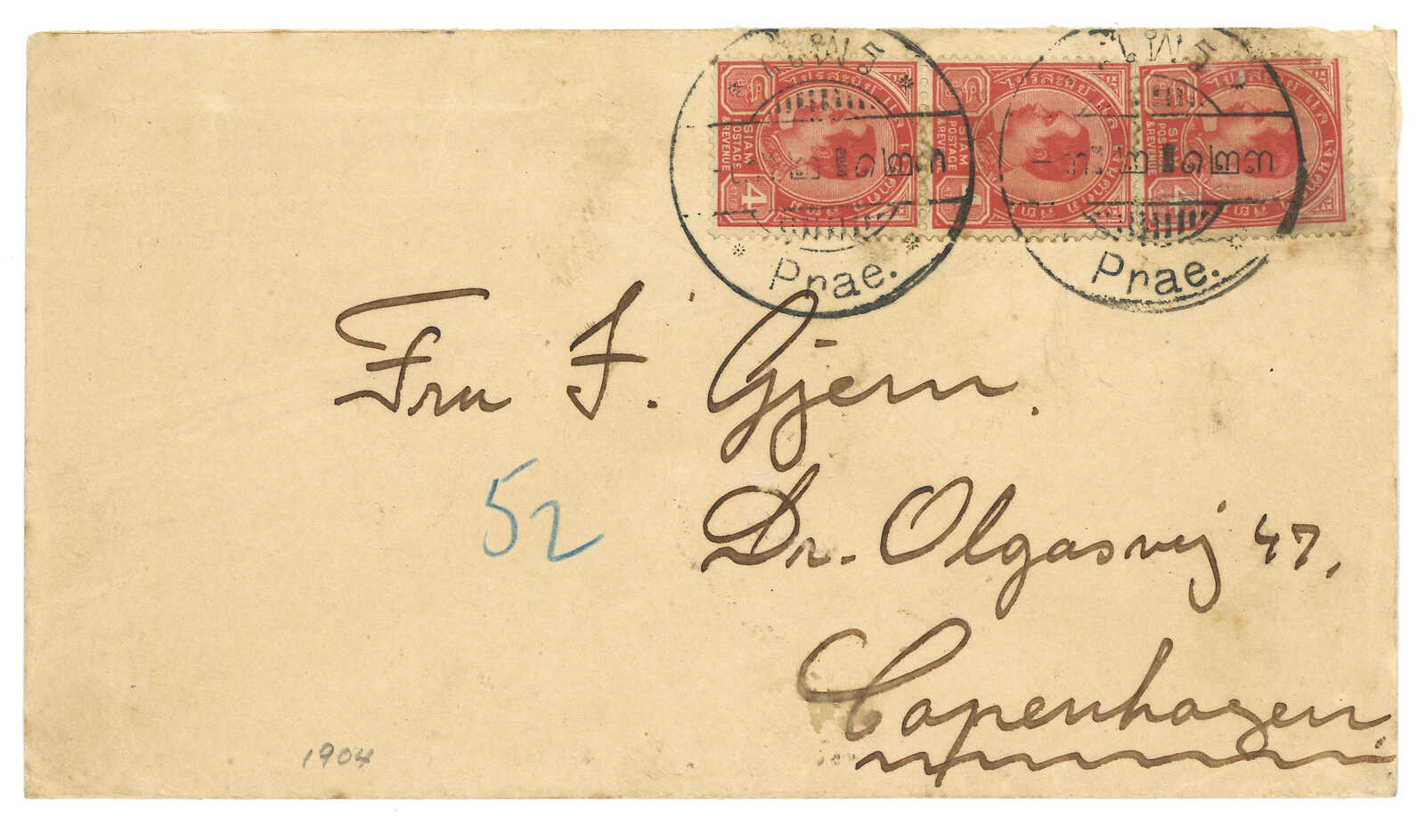 1904 Prae to Denmark, f.w. King Chulalongkorn 3rd issue 4a in strip of 3 (Somchai 81), tied by Prae cds. Transit Raheng (21 Nov).