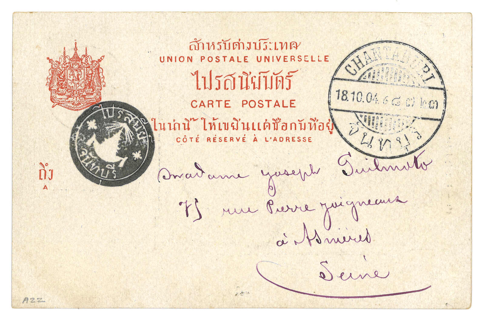1904 Chantaburi (18 Oct) to France. Picture postcard, f.w. King Chulalongkorn 3rd 1att, tied by Chantabouri cds. On content side with another type of Chantabouri cds and negative seal. No postage due was levied.