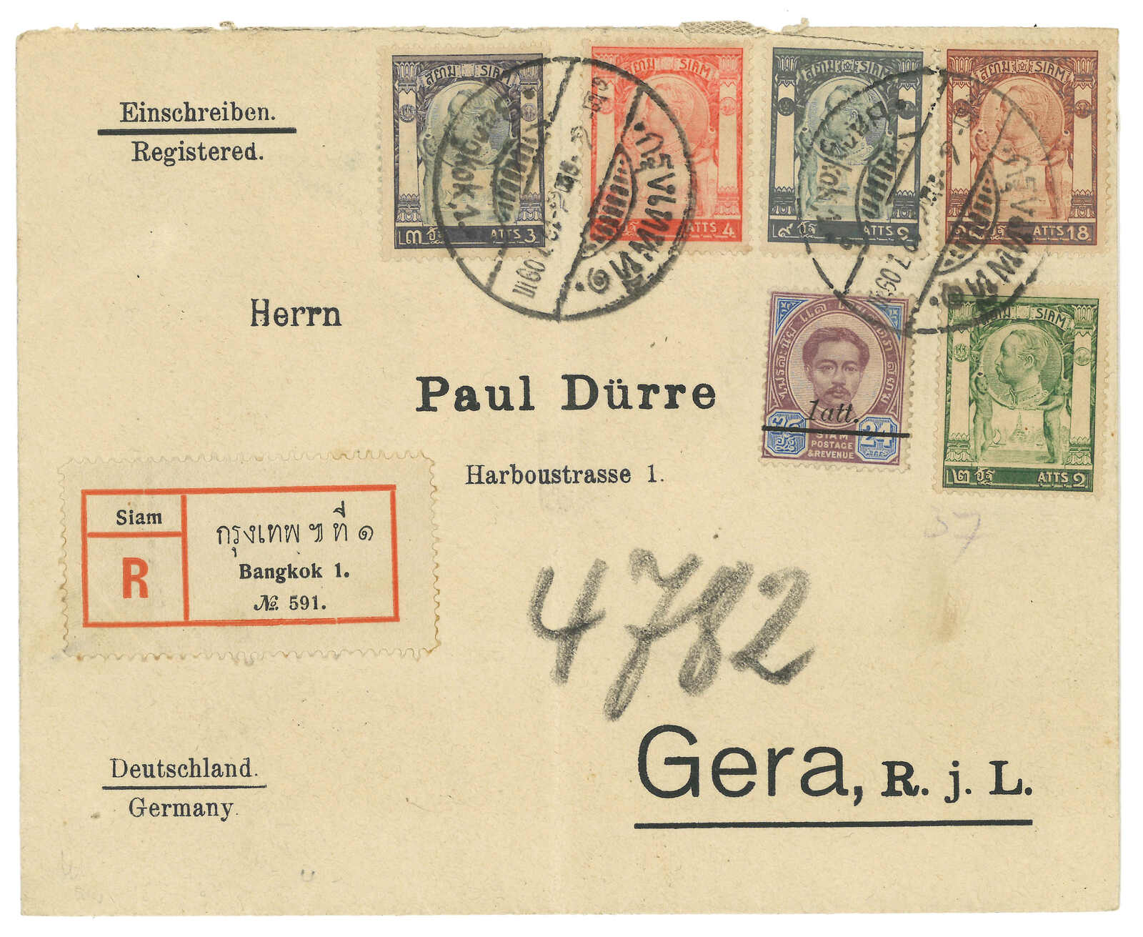 1909 Bangkok (12 Jul) to Germany. Registered cover, f.w. King Chulalongkorn surch 1a/24a (Somchai 116) + Wat Jang x5, in total of 37a, tied by Bangkok 1 cds, alongside with registered label. Transit Bangkok 2 (12 Jul).