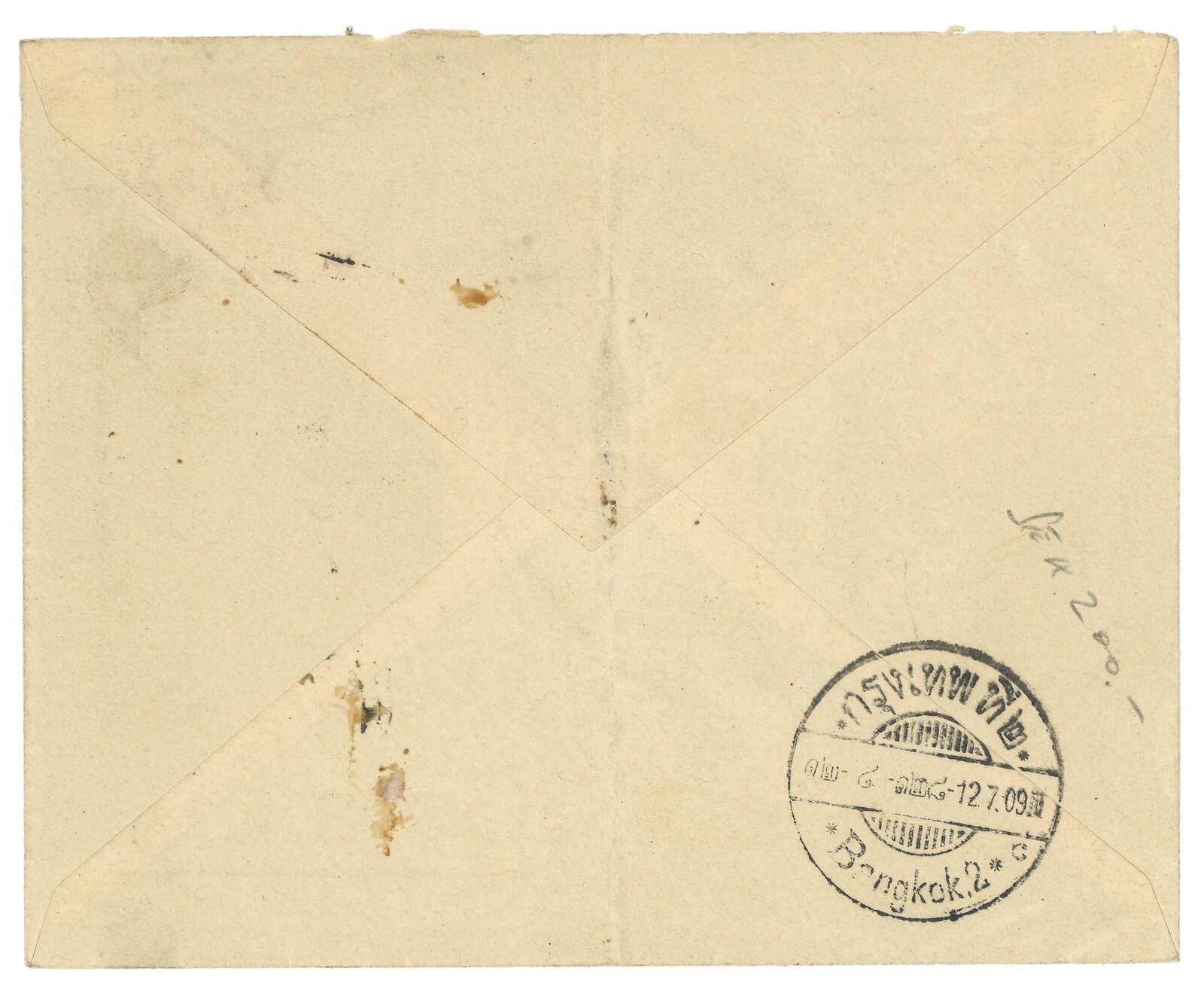 1909.7.12 曼谷寄德國。掛號封,貼朱拉隆功像改值1a/ 24a(Somchai 116)+鄭王廟5枚,合37a,銷曼谷1局日戳,旁貼掛號標籤。7.12經曼谷2局。(Image 1)