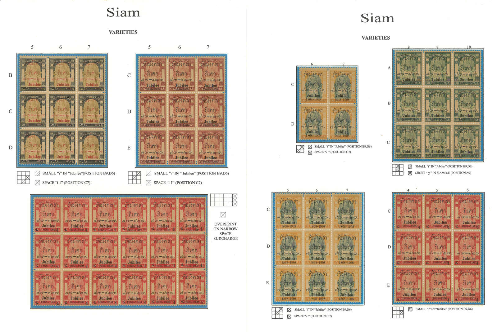 1908 a collection of KIng Chulalongkorn "Wat Jang" ovpt, Jubilee issues, containing 3 exhibit pages of 73 stamps, showcasing settings and varities on different denominations. Mostly in mint multiple. A very nice collection.