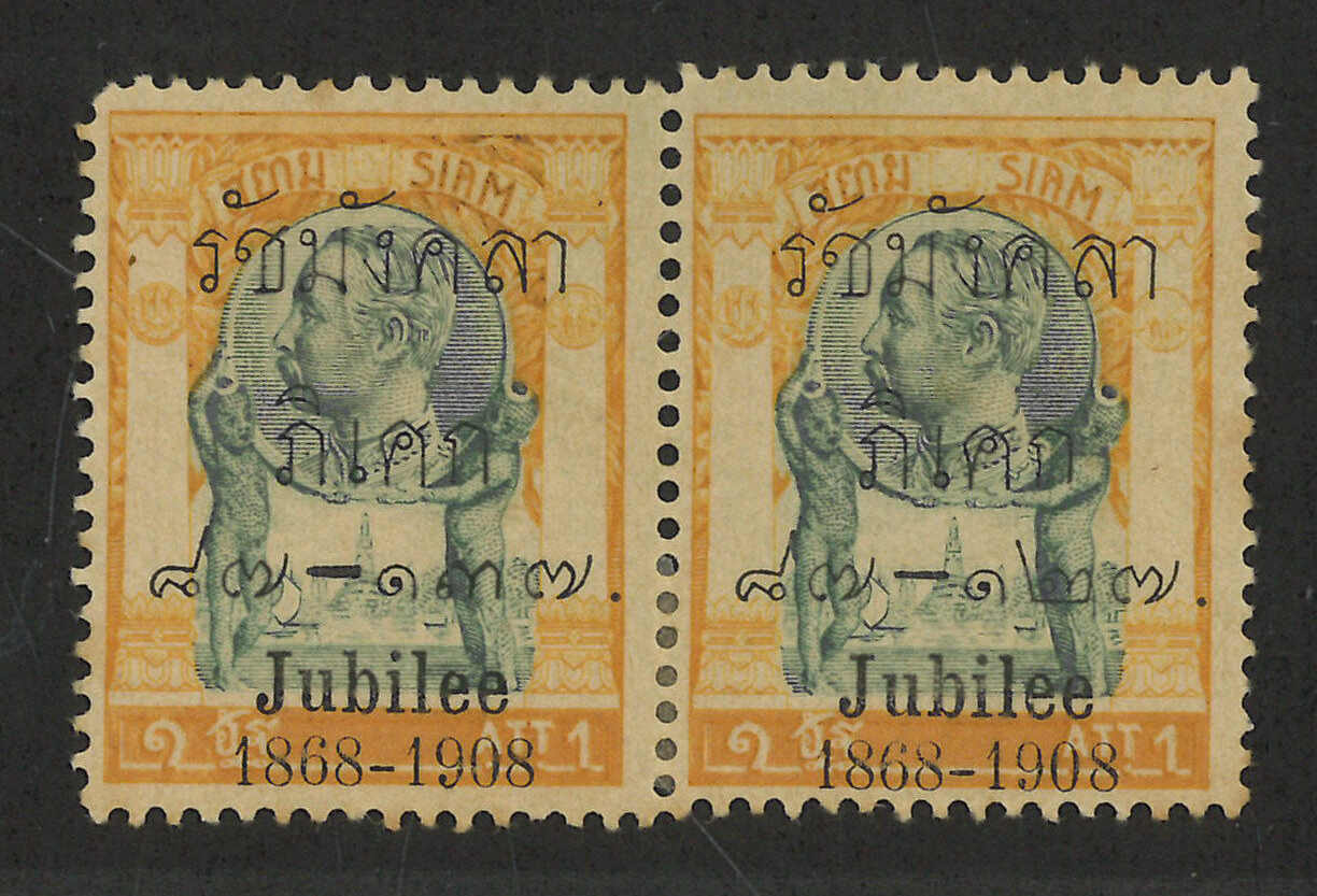 1908 King Chulalongkorn Wat Jang ovpt. Jubilee 1 Att in horizontal pair, left stamp with wrong date ovpt variety (Somchai 120a) while right stamp normal. MH with original gum. Exceptional variety pair.