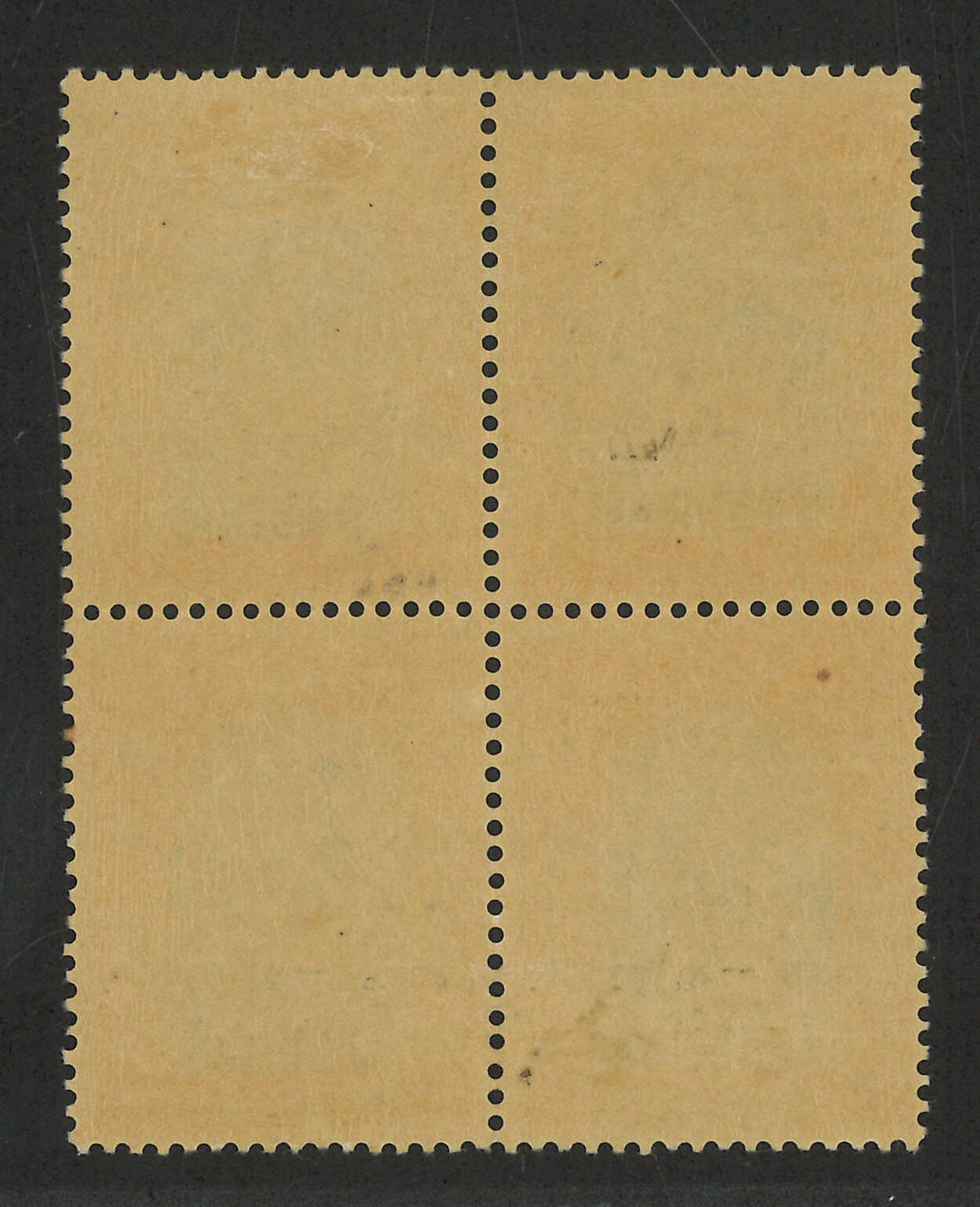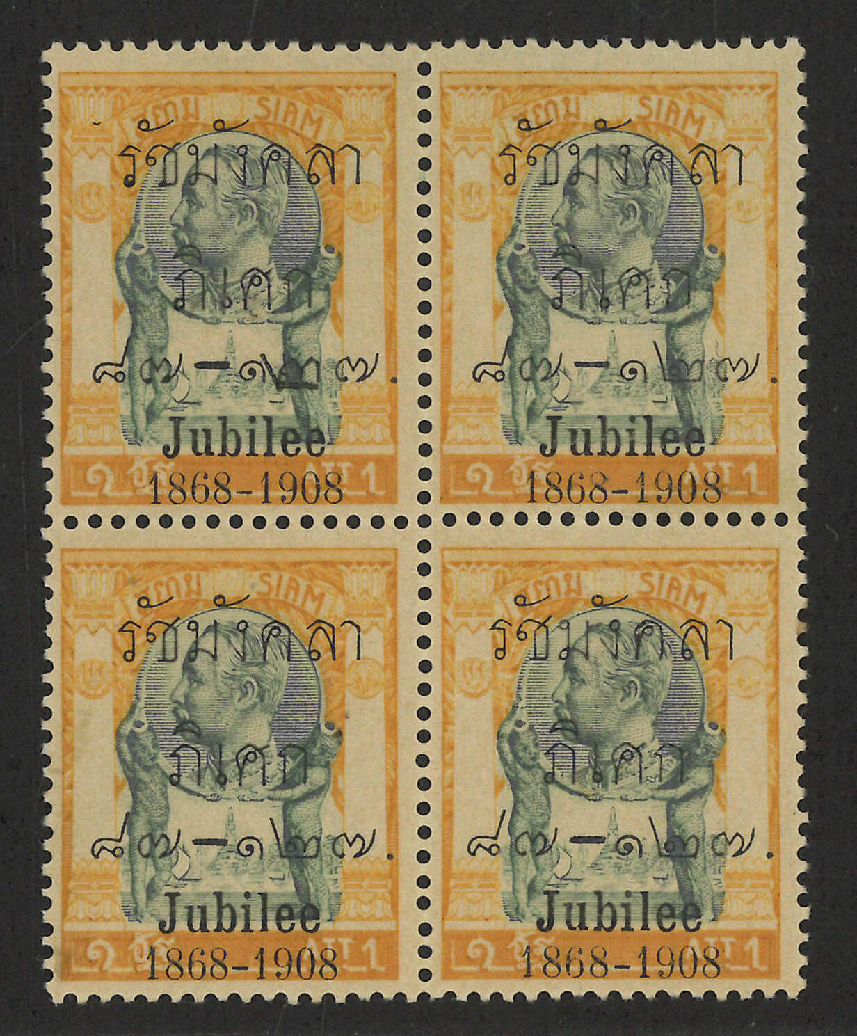 1908年11月朱拉隆功“鄭王廟”加蓋Jubilee 1 Att四方連連新,左上一枚帶錯誤泰文日期並以手劃改正(Somchai 120b)。原膠背貼。稀罕難得之變異連票。(Image 1)