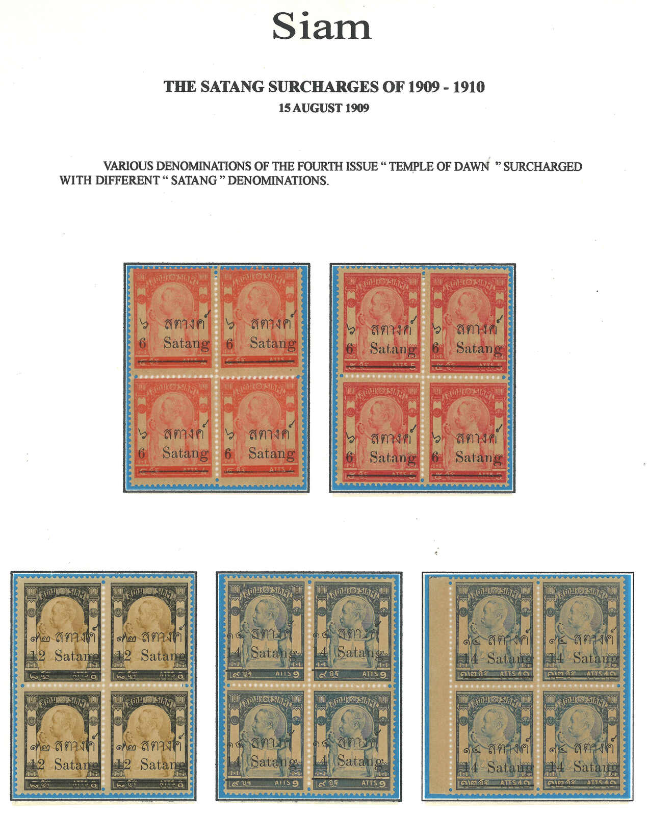 1909 King Chulalongkorn Wat Jang surch Satang issues complete set in block of 4, plus an exhibit page of 13 variety stamps. Former MH while latter showcasing large "6", large "S" and other varieties. A nice collection.