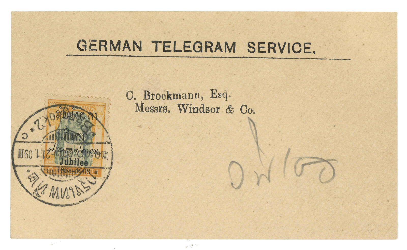 1909 (21 Jan) German Telegram Service cover used in Bangkok local, f.w. Wat Chang surch Jubilee 1a (Somchai 120), tied by Bangkok 2 cds.