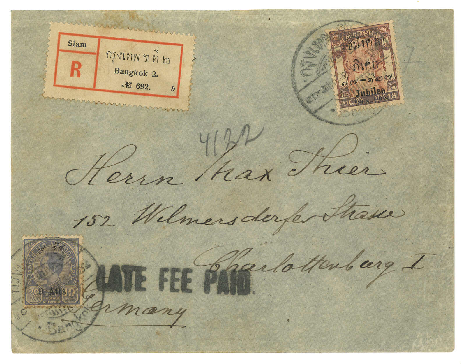 1909.8.30 曼谷寄德國。掛號封,右上貼鄭王廟改值Jubilee 18a(Somchai 124),左下貼朱拉隆功像改值9a/10a(Somchai 119),銷曼谷2局日戳,旁見掛號標籤及“LATE FEE PAID”橫戳。出色之遲遞例子。(Image 1)