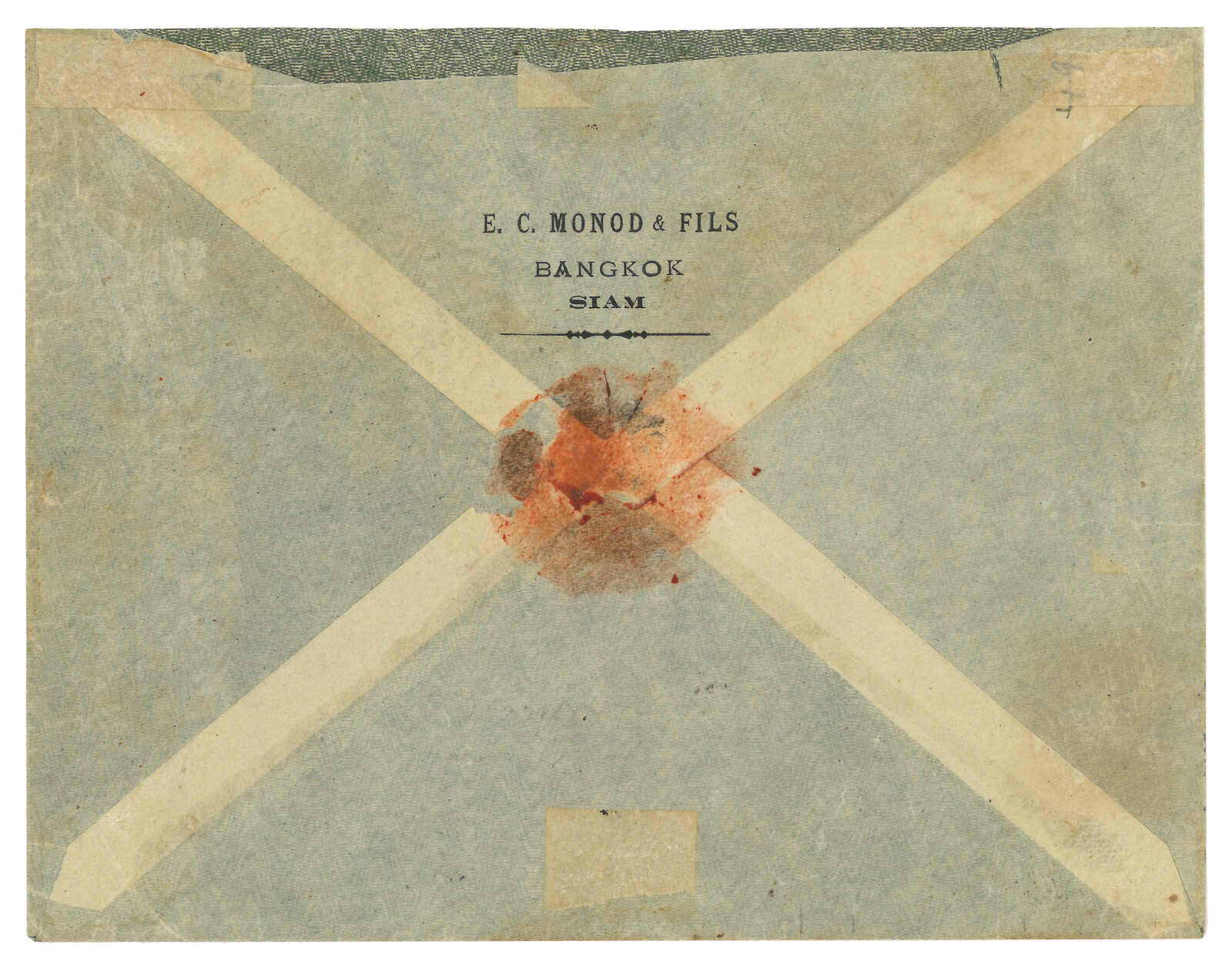 1908.10.21 曼谷寄法國。掛號封,背貼鄭王廟改值2 stg x 11 + 6 stg,合28 stg,銷曼谷2局日戳。正貼掛號標籤。11.1經橫濱-馬賽郵船。帶裂痕但不影響貼票。(Image 1)