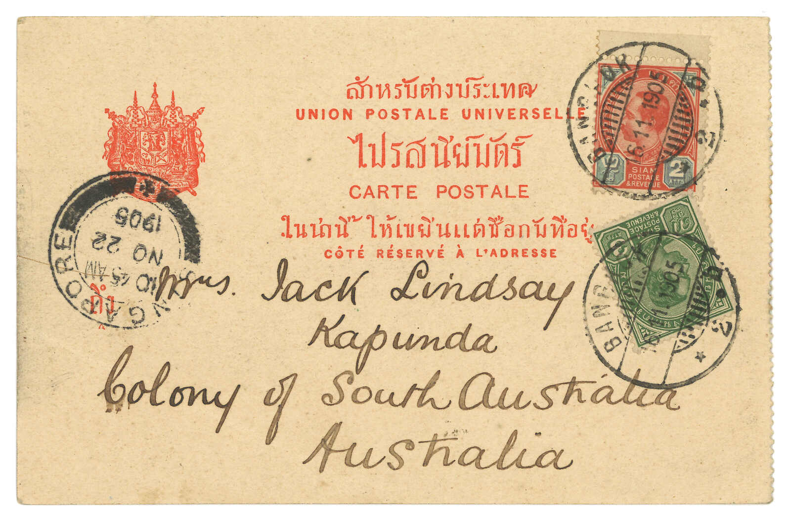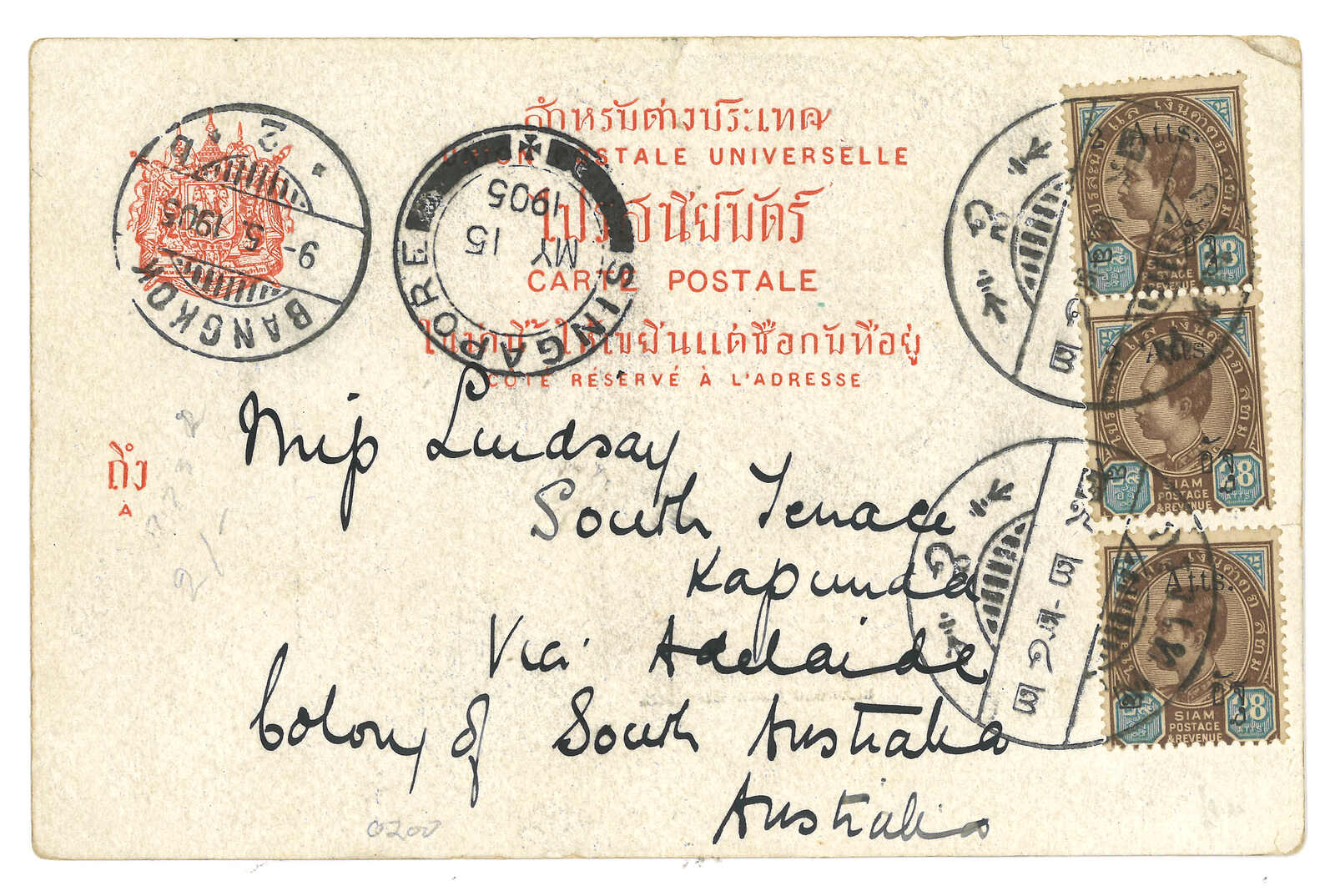 1905.11.16 曼谷寄澳洲。圖片明信片,貼朱拉隆功像2a + 4a,銷曼谷2局日戳。11.22經新加坡。(Image 1)