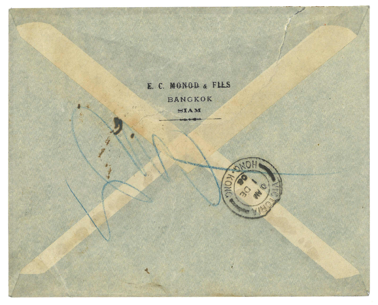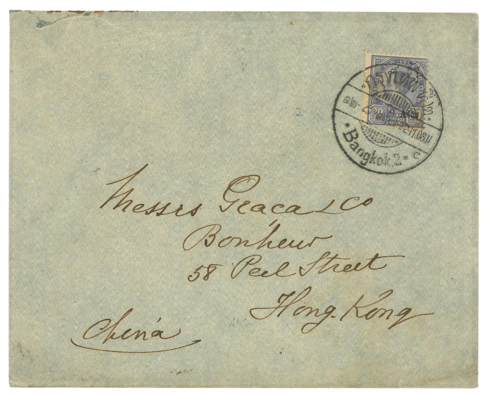 1908 Bangkok (12 Nov) to Hong Kong, f.w. King Chulalongkorn surch 9a/10a (Somchai 119), tied by Bangkok 2 cds. Arrived Hong Kong (1 Dec).