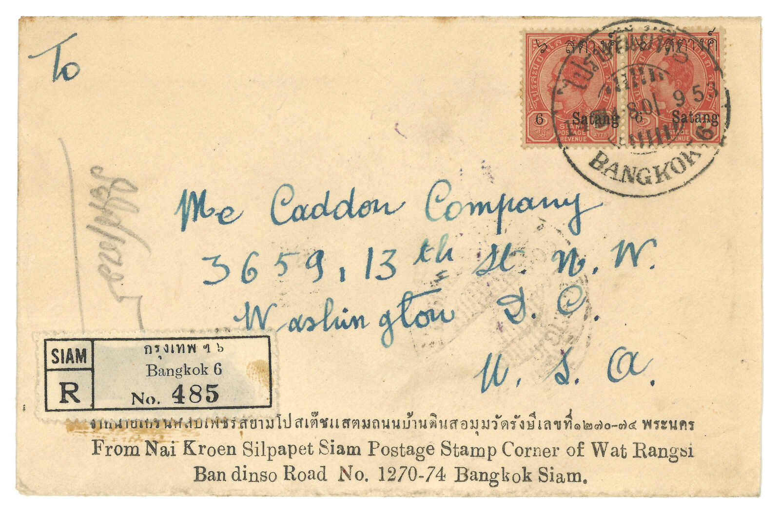1937.7.14 曼谷寄美國。掛號封,正背共貼朱拉隆功像改值6 Stg/6a雙連及橫三連(Somchai 145),銷曼谷6局日戳,旁貼掛號標籤。8.16經紐約。8.17抵華盛頓。此套票於1909年發行,甚晚之貼用。(Image 1)