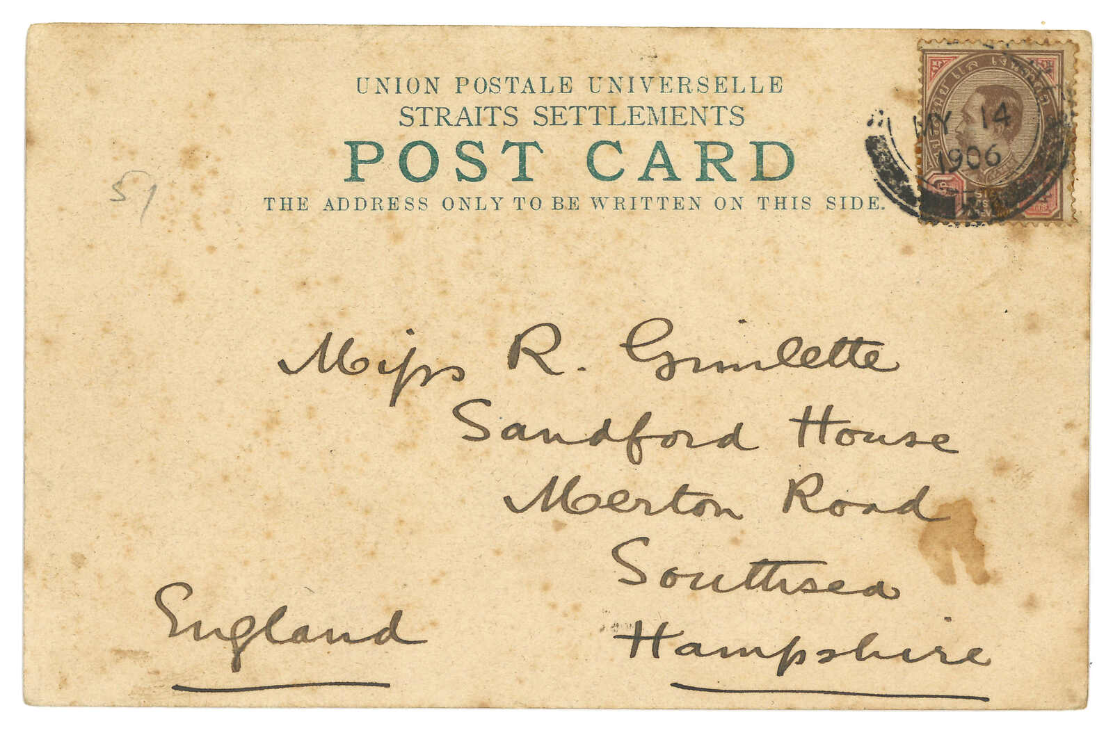 1906年吉蘭丹經新加坡寄英國。圖片明信片,貼朱拉隆功像第三版4a,5.14於新加坡蓋銷。暹羅票於新加坡蓋銷之例子。(Image 1)