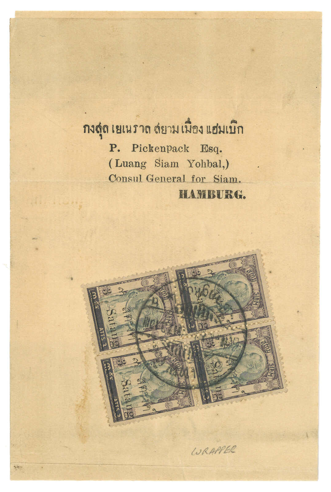 1910 (17 Mar) newspaper wrapper from Bangkok to Germany, f.w. Wat Chang surch 3 Stg/3a (Somchai 137) in block of 4, tied by Bangkok 4 cds.