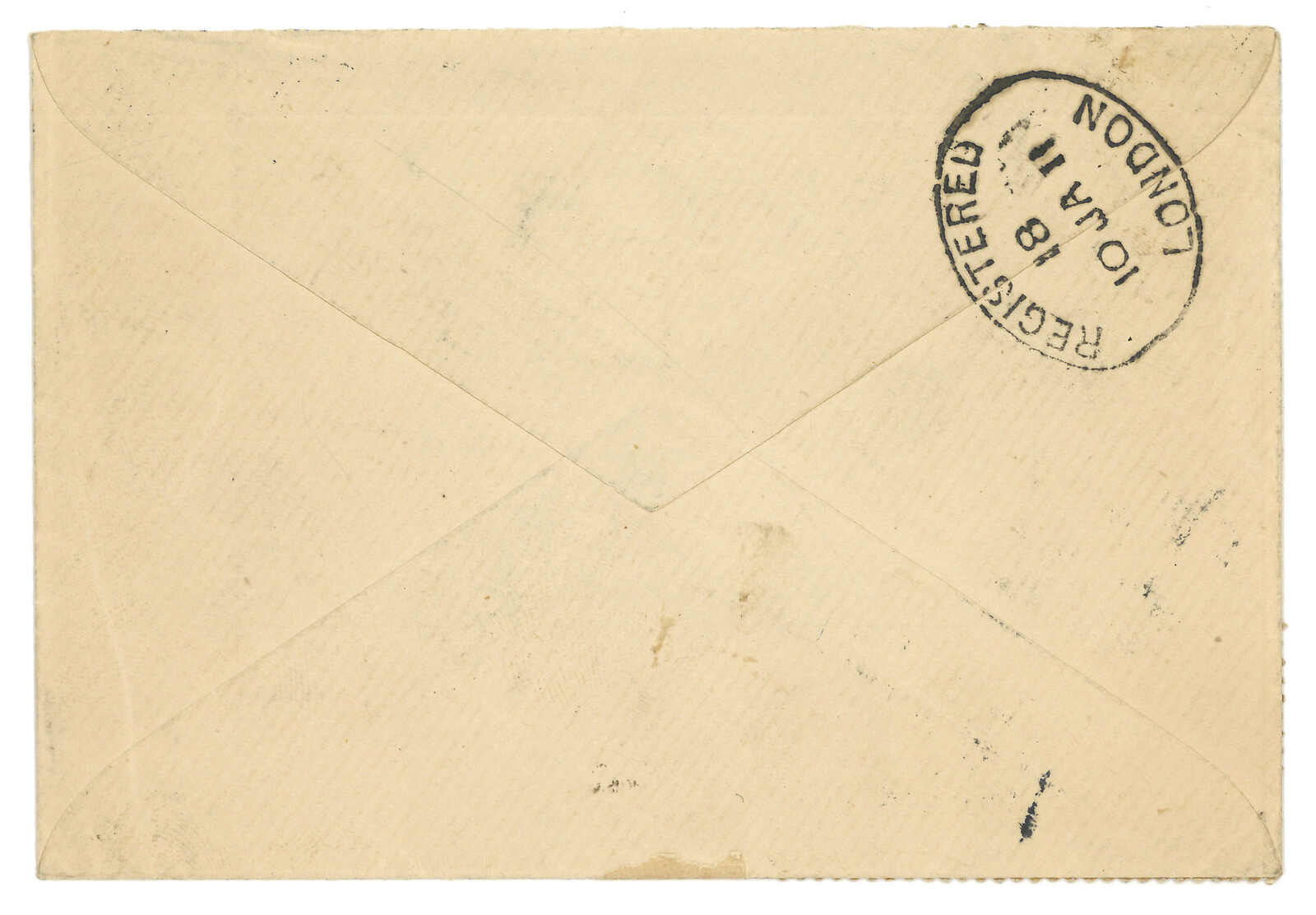 1910 Bangkok (14 Dec) to England. Registered cover, f.w. Wat Jang surch 2st + 3st + 6st + 14 st + King Chulalongkorn surch 6st/6a, tied by Bangkok 2 cds., alongside with registered label. Arrived London (10 Jan).