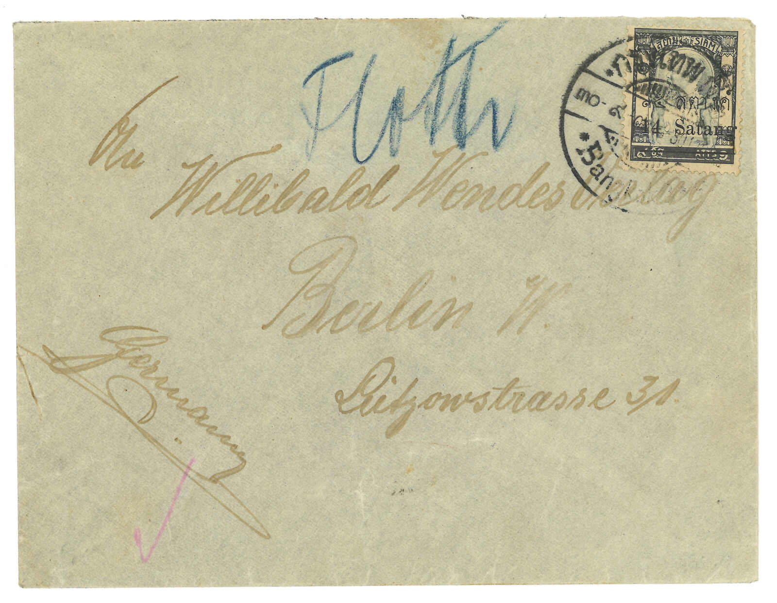 1909 Bangkok (30 Dec) to Germany, f.w. Wat Jang surch 14stg/9a (Somchai 143), tied by Bangkok 2 cds.