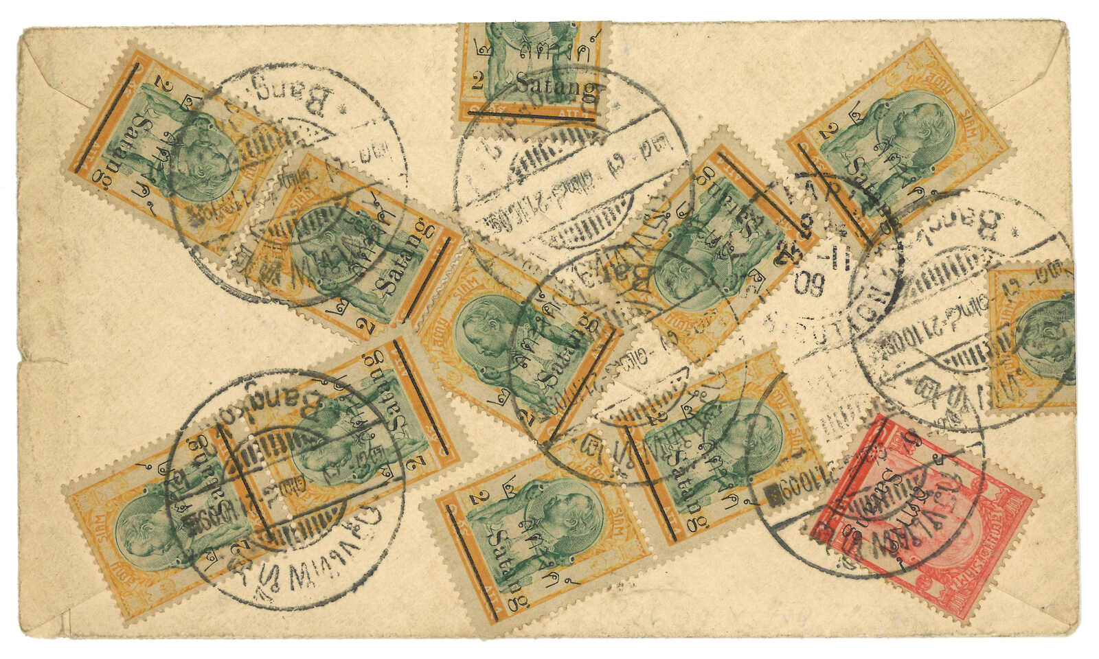 1909 Bangkok (21 Oct) to France. Registered cover, f.w. Wat Jang surch 2 stg x11 + 6 stg on reverse, in total of 28 stg, tied by Bangkok 2 cds. On front with registered label. Transit Yokohama-Marseiles paquebot (1 Nov). With