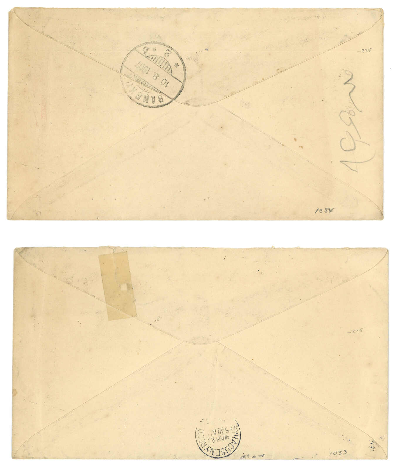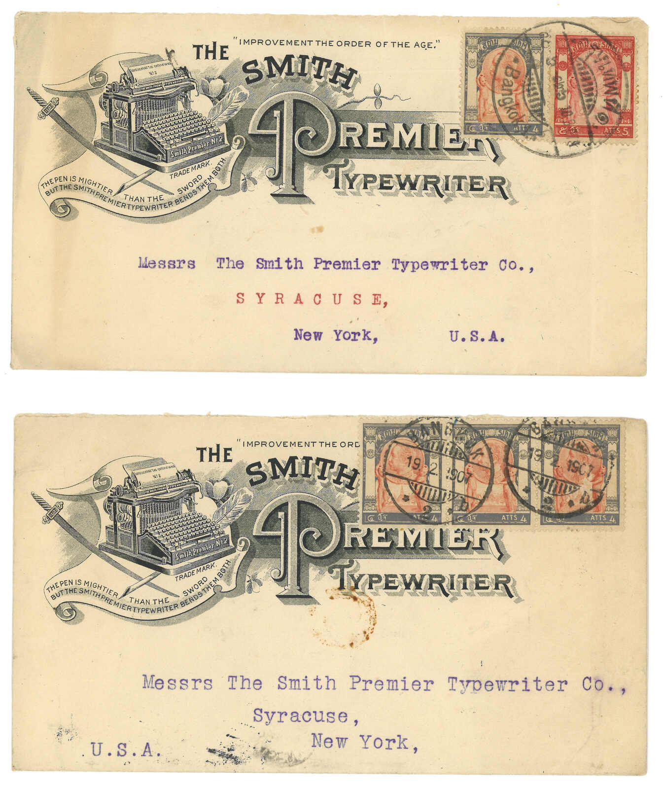 1907 a pair of "the Smith Premier Typewriter" covers from Bangkok to USA, f.w. Wat Jang 4a in strip of 3 and 4a + 5a respectively, tied by Bangkok 1 and 2 cds. Showcasing different rates.
