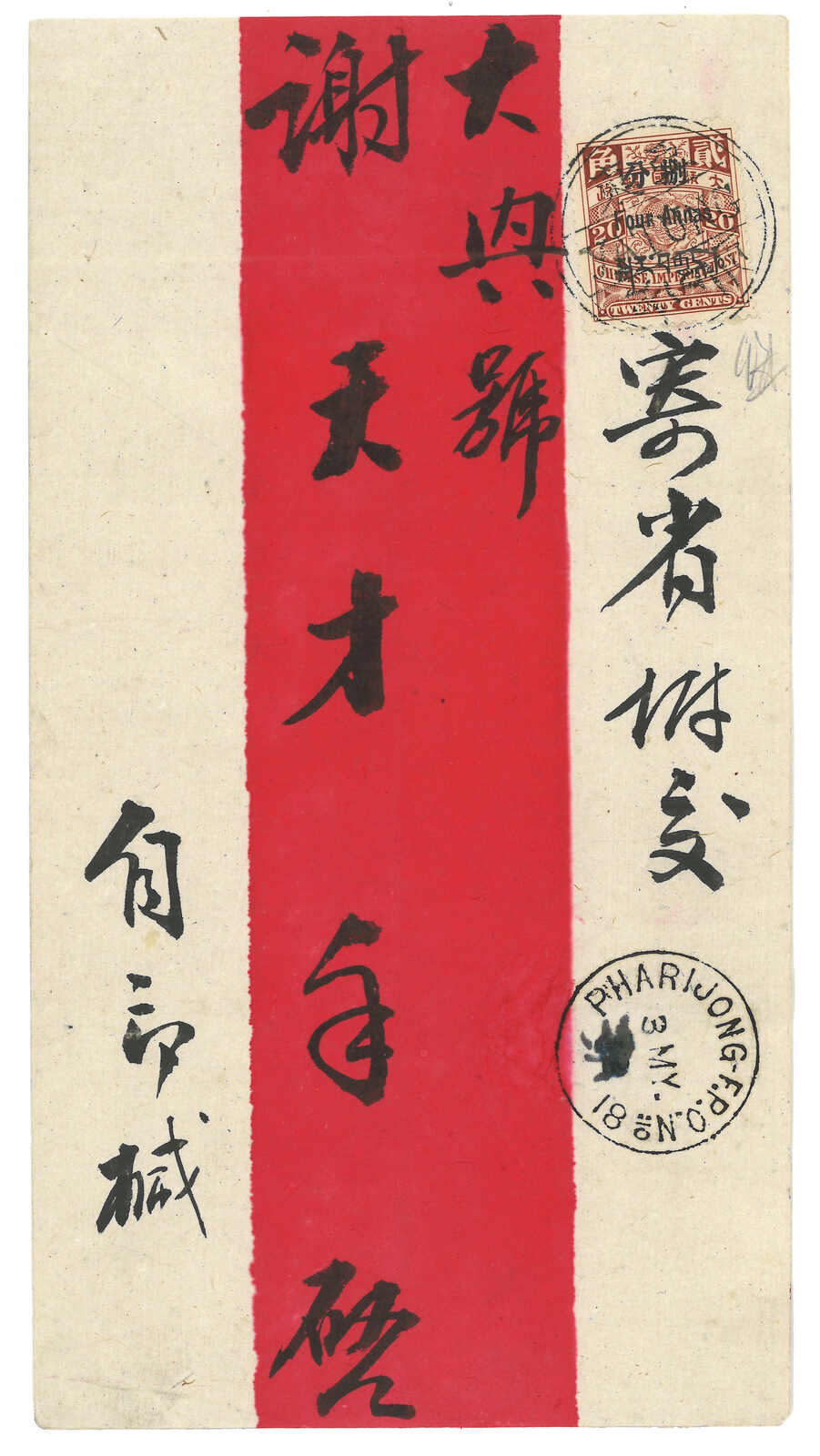 1413 cover image1912 Yatung (May) to Pharijong. Red band cover, f.w. Tibet surch Coiling Dragon 4a, tied by scarce Yatung Chinese PO type C1 trilingual h.s.. Arrived Pharijong (3 May) with extremely scarce Pharijong FPO No. 81 type B1 cds. Very late example of Yatung Chinese PO.