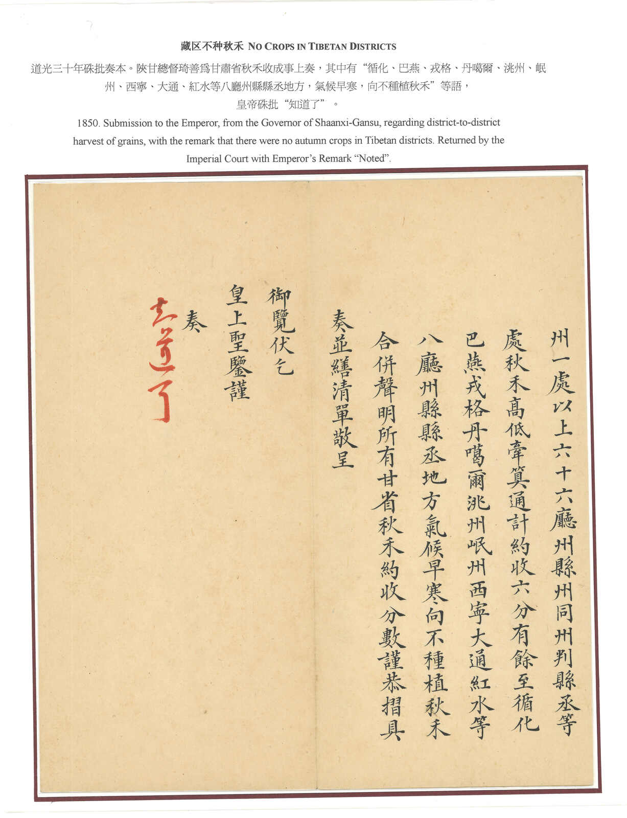 道光三十年(1850)硃批奏本,由陝甘總督琦善上奏,內容有關藏區歉收。帶有皇帝硃砒。(Image 1)