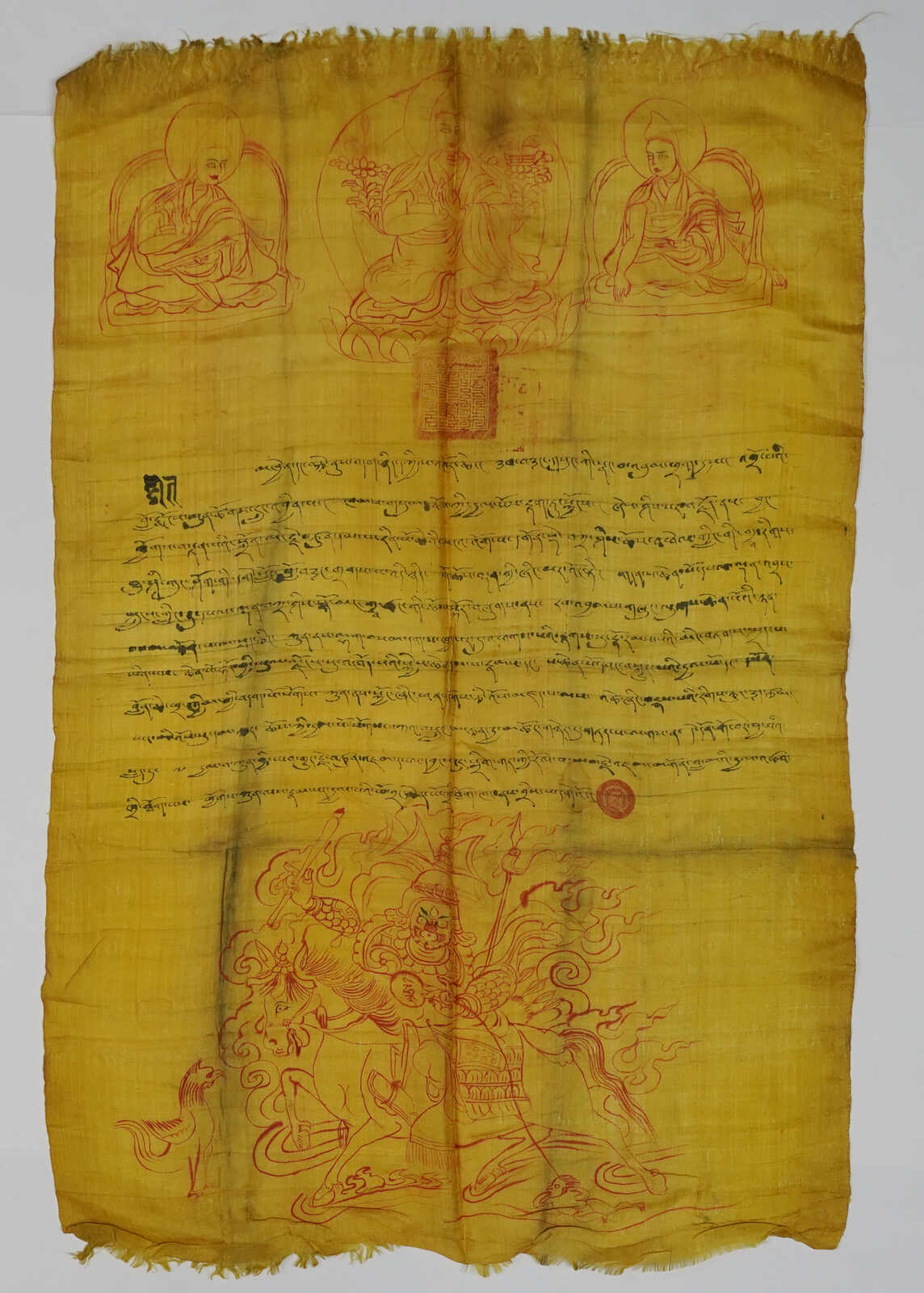 1396 image19th century. Tibetan tangka in yellow raw silk, with hand-painted deities at top and bottom. Teachings of lama written in the middle, applied with circular personal seal of lama, and rectangular official seal. Customarily hanged at alter in the monastery.