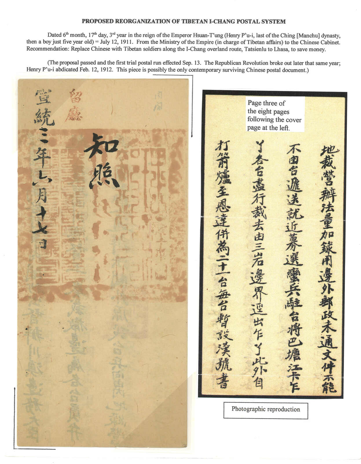 1385 cover image1911 (12 Jul) a document from the Ministry of the Empire to the Chinese Cabinet, regarding the a recommendation of replacing Chinese soldiers with Tibean soliders along the Yizhan route between Tatisienlu and Lhasa in order to save cost. The suggestion was finally approved. Illustration fig 34, p. 59 in "Tibet Stamps and Postal History" by Steve Chazen and Danny Wong.