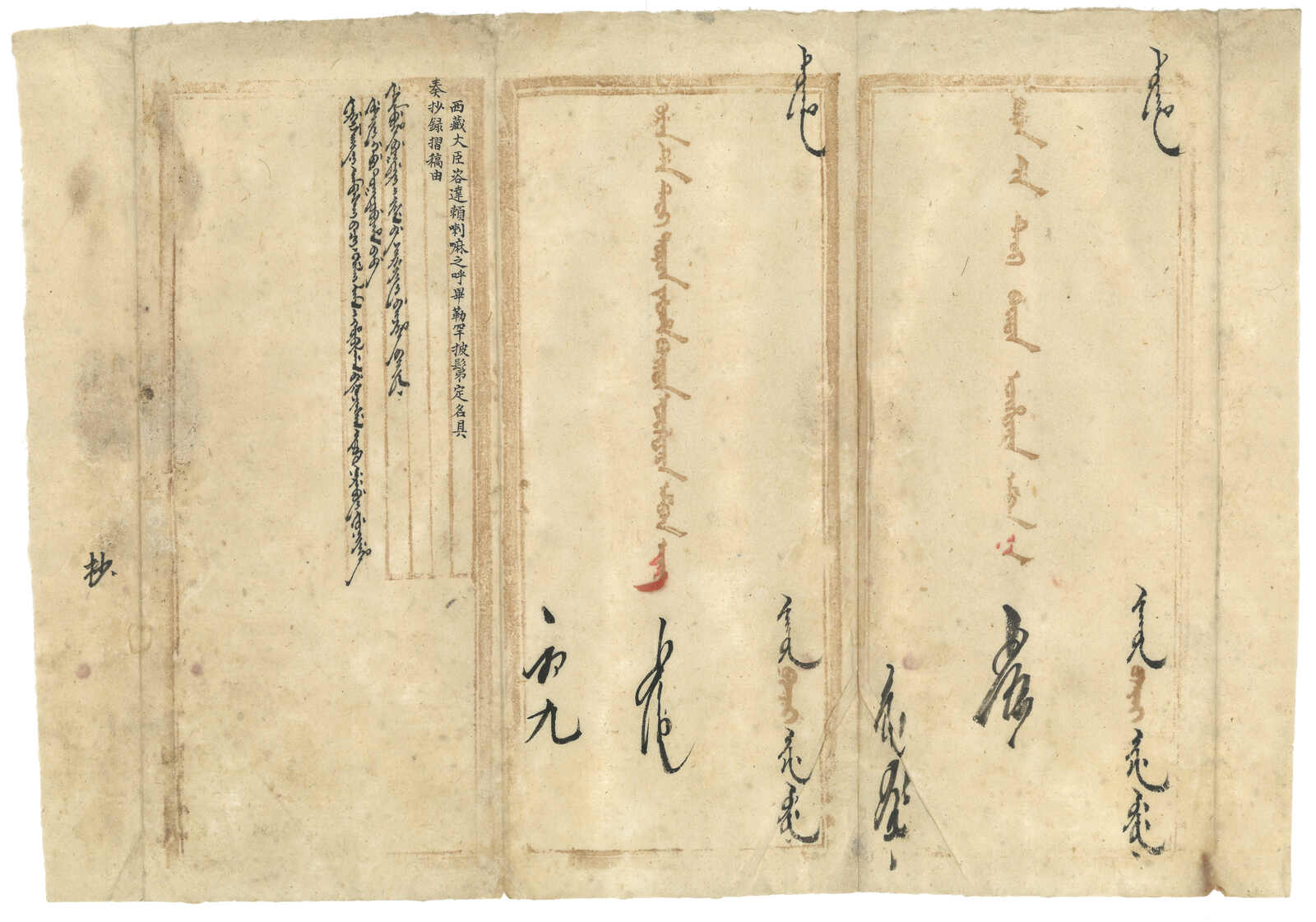 1384 cover image1895 a letter from Grand Council, documenting the mission of Panchen Lama to Peking. Applied with six Gramd Council seal. In 1895, Panchen Lama dispatched a mission to the emperor.