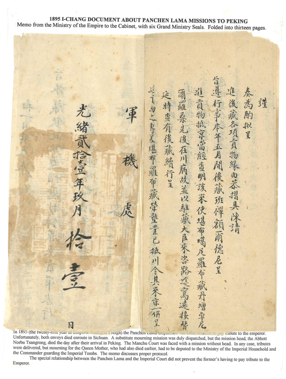 1895年軍機處信件一份,記錄了班禪喇嘛訪京,鈐有六處紅印。1895年,班禪喇嘛進京朝貢。(Image 1)