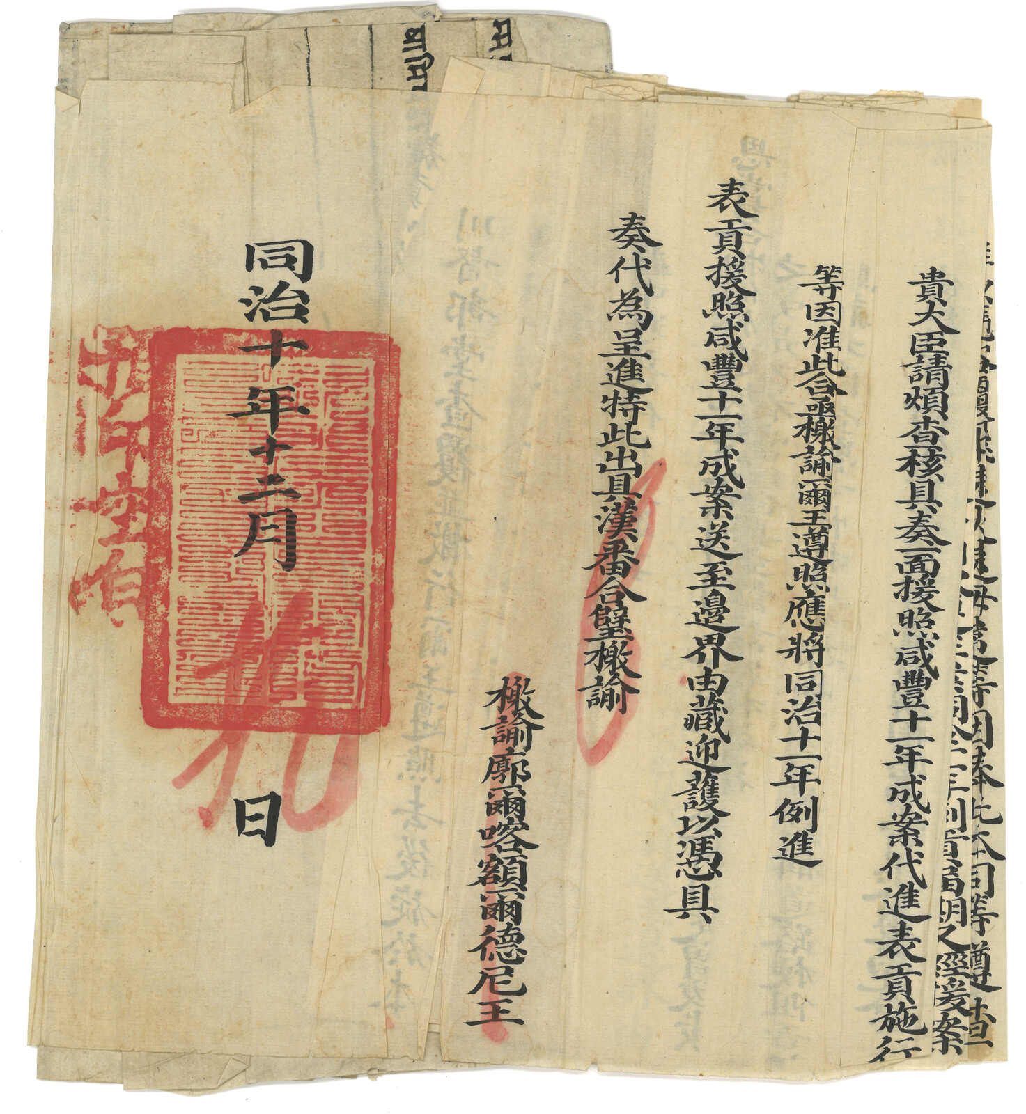 1872.1 駐藏大臣寄廓爾喀國王信件,以漢文及藏文書寫,鈐有駐藏大臣官印。內容為同意因路況惡劣而將貢品送至廓藏邊界。(Image 1)
