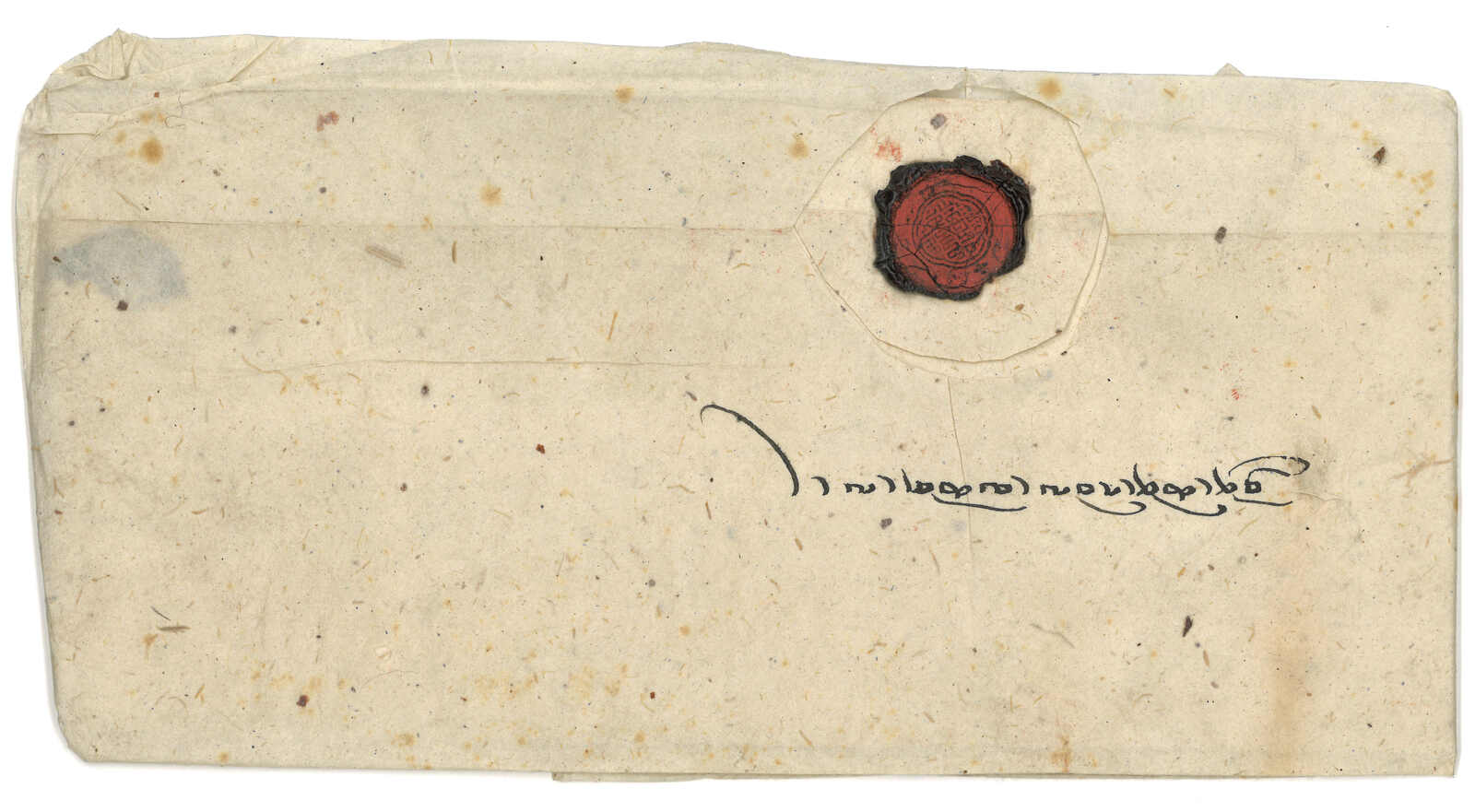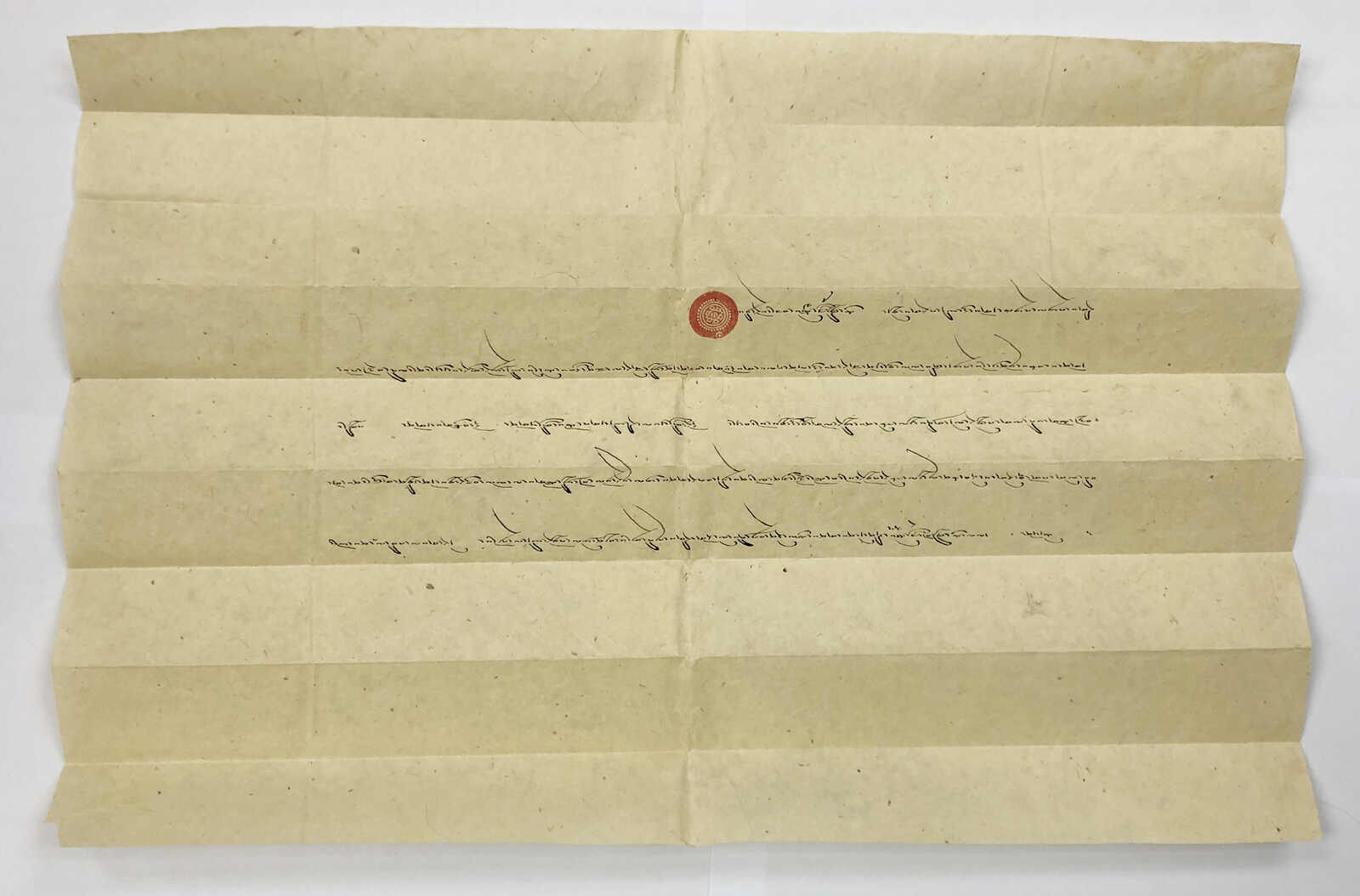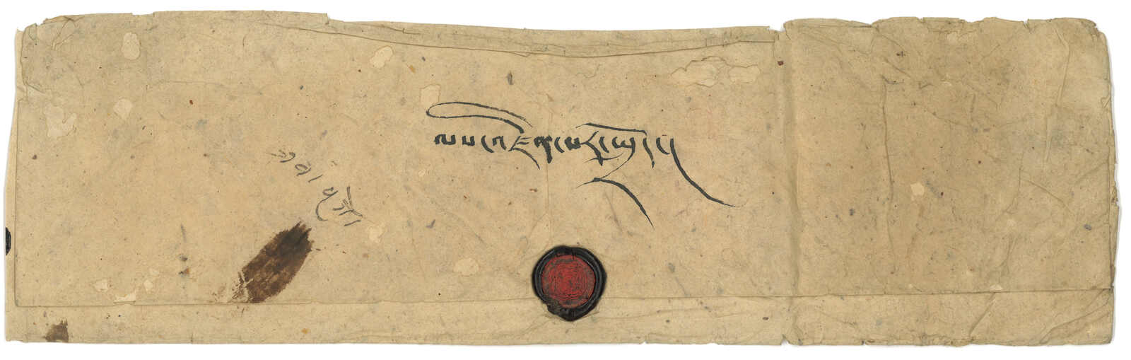 一件達賴喇嘛寄Charles Bell信件,帶有達賴喇嘛紅色圓形火漆(Dawson no.6)。Charles Bell為十三世達賴喇嘛之好友。(Image 1)